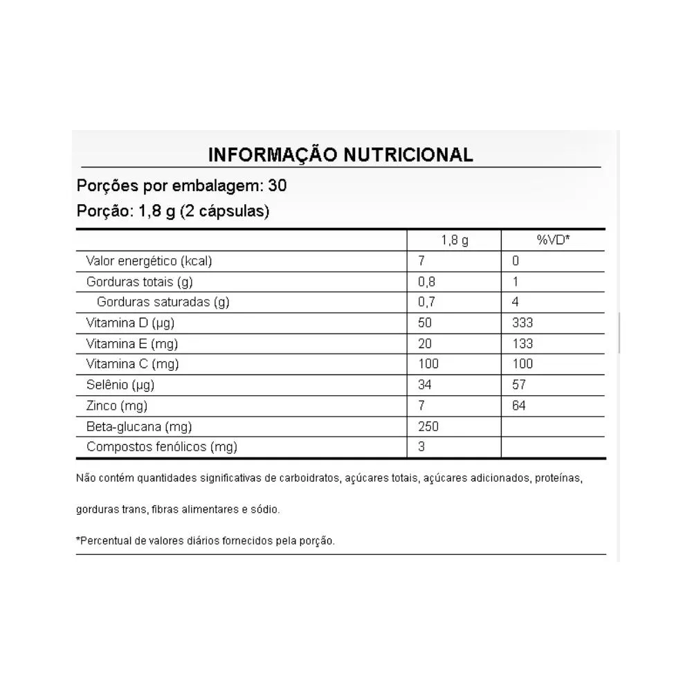COMPOSIÇÃO: Óleo de coco, cápsula gelatinosa (gelatina, água purificada, umectante glicerina e corante natural clorofilina cúprica), beta-glucana de levedura (Saccharomyces cerevisiae), ascorbato de cálcio (vitamina C), extrato de própolis, D-alfa-tocoferol (vitamina e), bisglicinato de zinco, L-selenometionina, colecalciferol (vitamina D) e emulsificante lecitina. ALÉRGICOS: PODE CONTER* SOJA, LEITE, PEIXES, OVOS, AMENDOIM, AMÊNDOA, AVELÃS, CASTANHA-DE-CAJU, CASTANHA-DO-PARÁ, MACADÂMIAS, NOZES, PECÃS, PISTACHES, PINOLI, CASTANHAS, CRUSTÁCEOS (KRILL E CARANGUEJO), TRIGO, CENTEIO, CEVADA, AVEIA E SUAS ESTIRPES HIBRIDIZADAS. CONTÉM GLÚTEN. *Não fazem parte da formulação do produto. No entanto, pode haver traços devido ao compartilhamento de equipamento em alguma etapa do processo produtivo. SOBRE A LOJA: Somos a rede de farmácias mais antiga de São José dos Pinhais, atuando no ramo farmacêutico desde 1990 com comprometimento à qualidade e satisfação do cliente. É um prazer compartilhar os nossos valores e as nossas conquistas com quem confia no nosso trabalho! Imagens dos Produtos são Meramente Ilustrativas. Todas as Informações Divulgadas são de Responsabilidade Exclusiva do Fabricante/fornecedor.