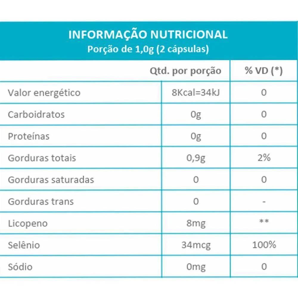- Combina licopeno e selênio para ação antioxidante.