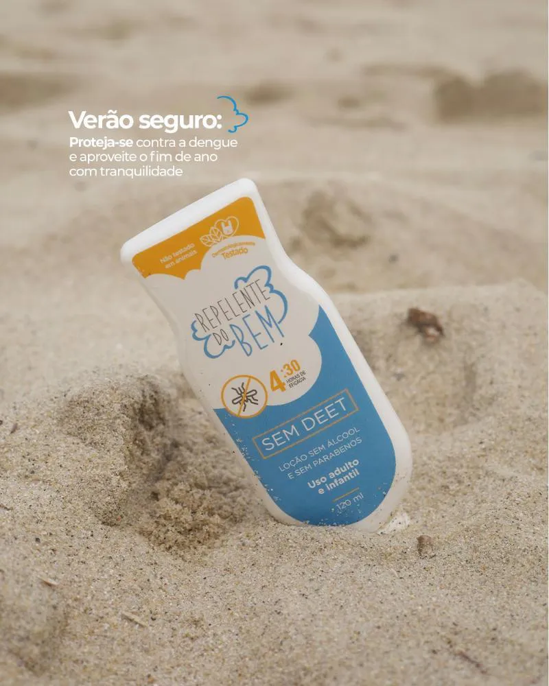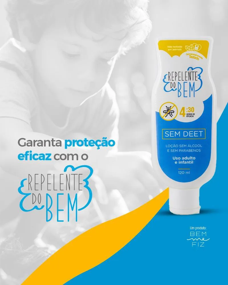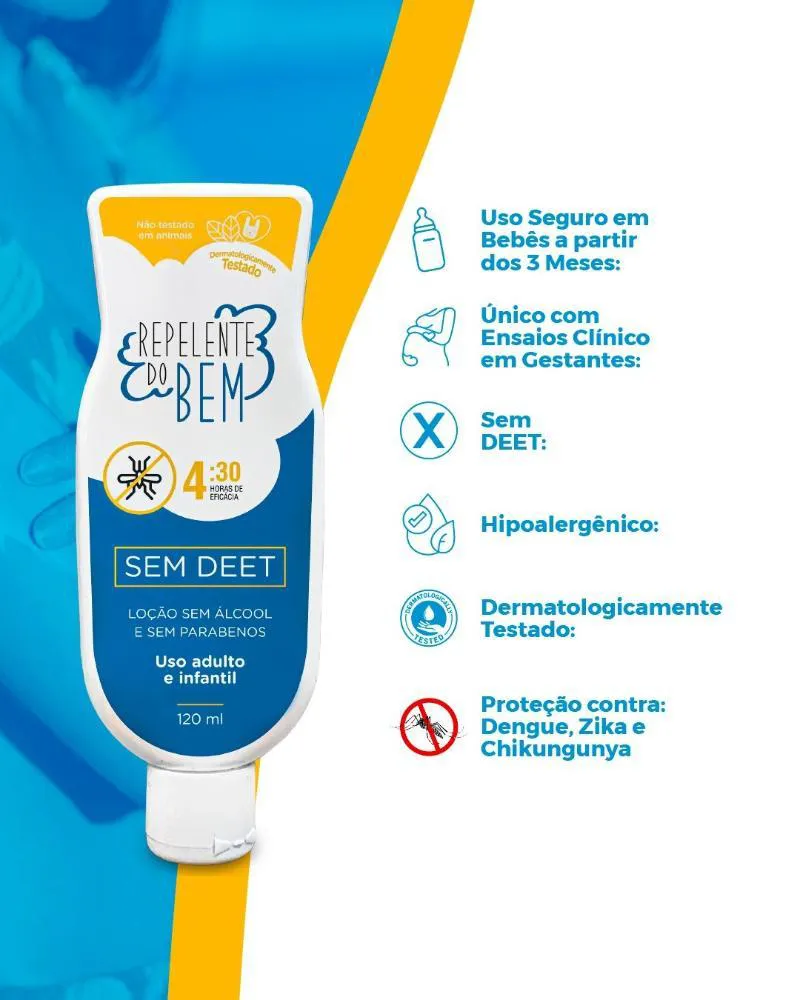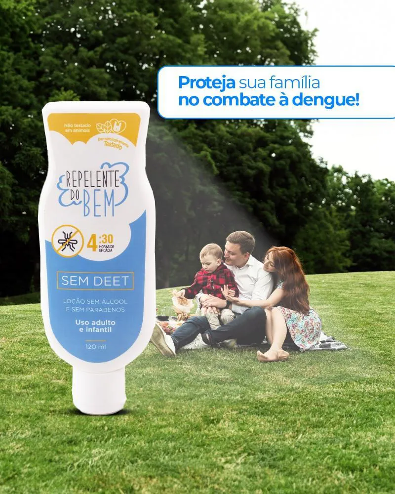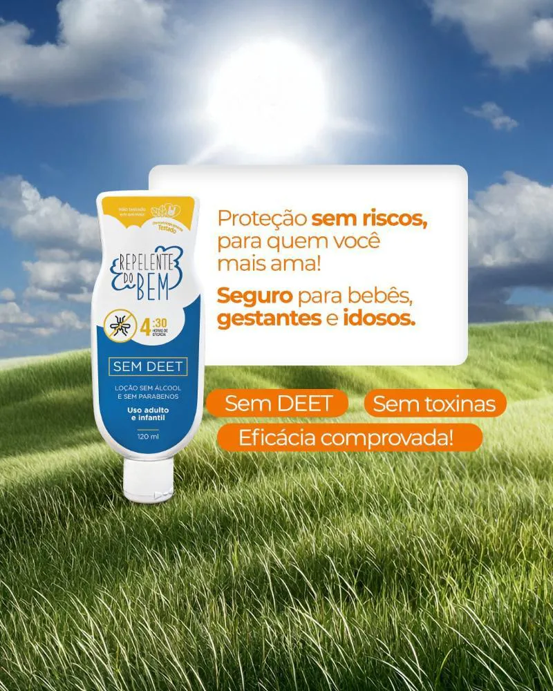 A Loção Repelente do Bem 120ml é a escolha perfeita para proteger sua família contra mosquitos e outros insetos. Com uma fórmula inovadora sem álcool e sem Deet (componente químico N,N-dietil-meta-toluamida), este repelente é ideal para adultos e crianças, oferecendo segurança e conforto, mesmo para peles sensíveis. Desenvolvida com uma textura leve e de rápida absorção, a Loção Repelente do Bem não deixa a pele oleosa. Sua fragrância suave proporciona uma experiência agradável, garantindo proteção duradoura tanto em ambientes internos quanto externos. É o produto ideal para passeios, viagens, atividades ao ar livre e uso diário. Benefícios:- Proteção eficaz contra mosquitos e insetos.