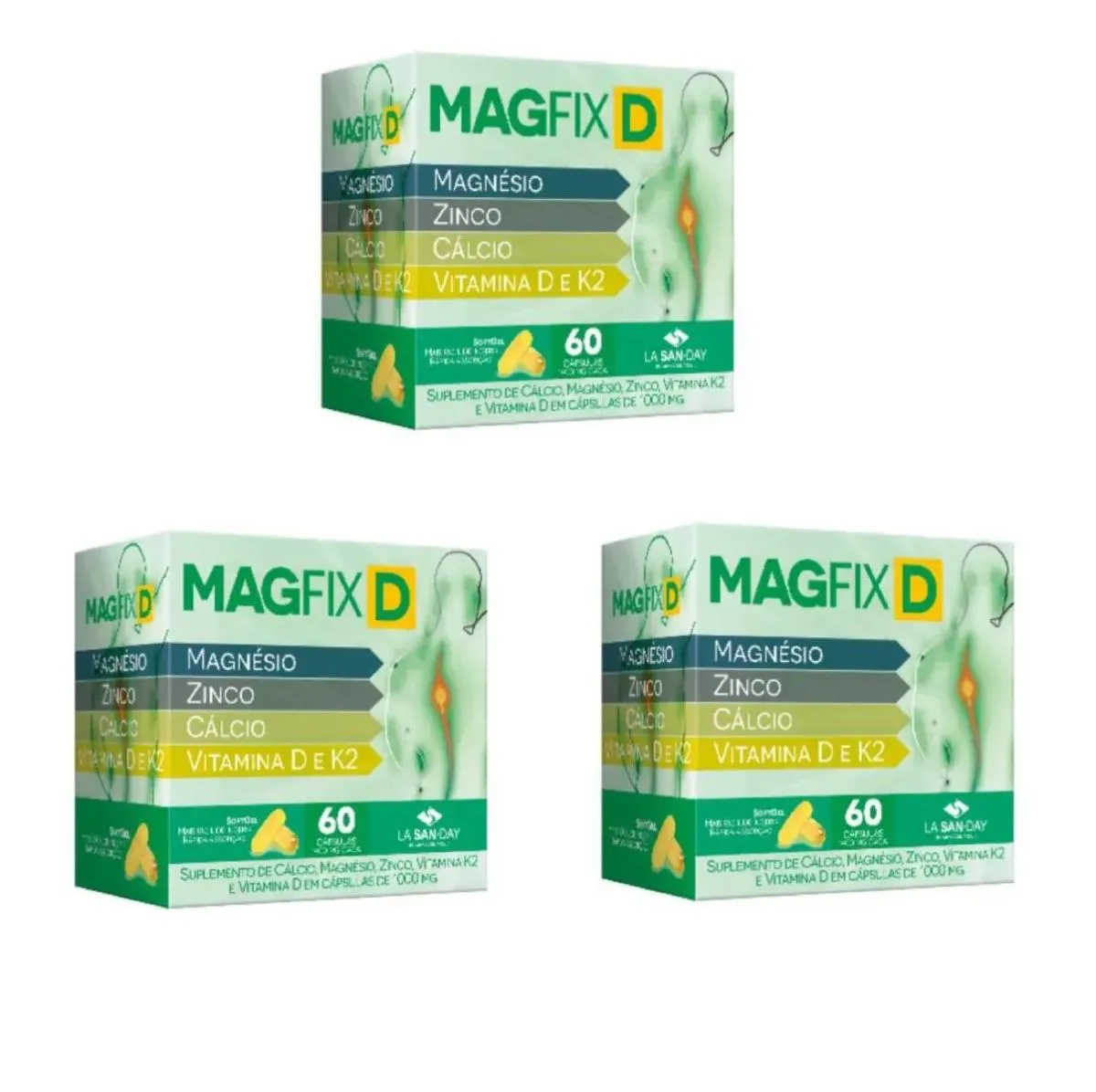 Kit 3 Magfix D Mg, Zn, Ca, Vit D3 e K2 60 Cápsulas