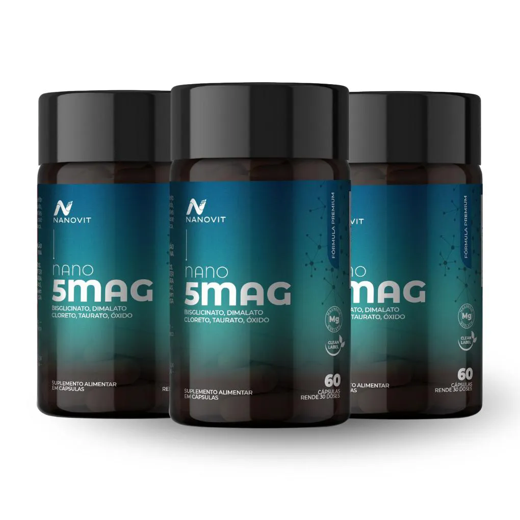 Kit 3 Magnésio 5 em 1 – Dimalato, Bisglicinato, Cloreto, Taurato e Óxido, 60 Cáps Nanovit Nano 5Mag O NANO 5MAG da Nanovit é o suplemento de magnésio mais completo do mercado, combinando estrategicamente cinco formas diferentes de magnésio. Sua fórmula poderosa atua em diversas áreas do organismo, e o seu uso diário proporciona redução do estresse, mais energia, suporte ao desempenho e recuperação muscular, além de auxiliar no bem-estar do coração e dos ossos. Diferenciais: · Marca chancelada pelo maior médico do Brasil · Produtos com fórmula Clean Label · Livre de corantes artificiais · Livre de Dióxido de Titânio · Formulação equilibrada com cinco magnésios quelados. · Único suplemento 5 em 1 no mercado. · Produto original e direto da fábrica para sua casa. 1 – Apresentação e dosagens: Quantidade de potes: 1. Pote com 60 cápsulas.