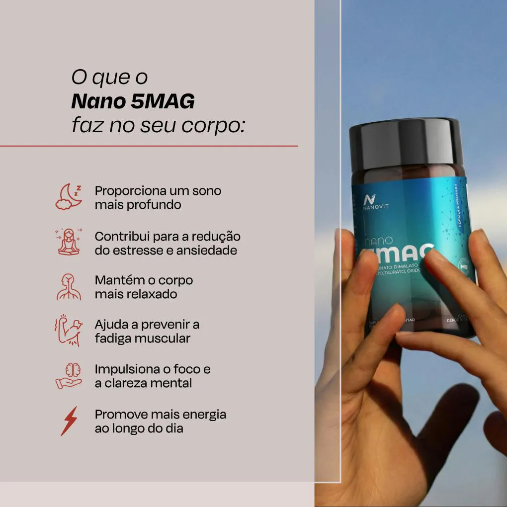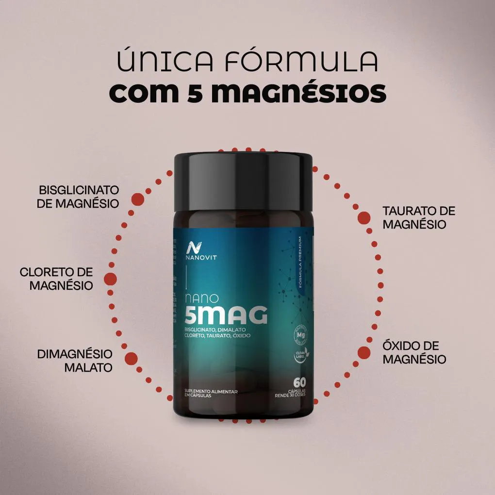 Peso Líquido: 30g. Validade: 01/2028. Porção: 2 cápsulas (1,0 g), contém: 5 Magnésios quelados: (260 mg) Isso se traduz na fórmula mais completa do mercado quando se fala de suplemento à base de Magnésio. Fórmula exclusiva Nanovit Nutrition® 2 – Ingredientes: Bisglicinato de magnésio, dimagnésio malato, cloreto de magnésio, taurato de magnésio, óxido de magnésio, amido de milho. Antiumectantes: dióxido de silício e estearato de magnésio. Ingredientes da cápsula: gelificante carragena, glaceante hidroxipropilmetilcelulose (HPMC). Conservante: acetato de potássio. Corante: clorofila cúprica. NÃO CONTÉM GLÚTEN / NÃO CONTÉM LACTOSE 3 – Sugestão de uso Ingerir duas (2) cápsulas à noite, junto a uma refeição, ou de acordo com a orientação de nutricionista e/ou médico 4 - Recomendações: Conservar ao abrigo da luz, calor e umidade. Após aberto consumir em até 30 dias. Produto indicado para o grupo populacional de 19 anos. Este produto não é um medicamento. Não exceder a recomendação diária de consumo indicada na embalagem. Mantenha fora do alcance de crianças. Gestantes, lactantes e crianças só devem ingerir este produto sob orientação de um profissional de saúde. O Nano 5Mag da Nanovit segue a regulamentação da RDC nº 243/2018 da Anvisa e está devidamente enquadrado na RDC 990/2025 5 – Aviso legal: • Idade mínima recomendada: 19 anos • Consumir junto com alimentos facilita a assimilação • Este produto é um suplemento alimentar, e não um medicamento. Suplementa dietas insuficientes. Consulte seu médico e/ou farmacêutico. 6 – Sobre a Nanovit Nanovit é uma marca de suplementos e vitaminas que tem aprovação médica e clínica dos maiores especialistas do Brasil em saúde integrativa. Seus produtos são todos desenvolvidos em parceria com médicos renomados, nutricionistas e farmacêuticos. As matérias primas são rastreadas e importadas, garantindo máxima eficiência para o consumidor final. O compromisso com a qualidade e atendimento são inabaláveis, possui canais próprios de atendimento e selos de reputação verde em reciclagem, boas práticas de fabricação e atendimento. Todos os produtos são devidamente notificados na Anvisa e FDA EUA. Sua produção é livre de corantes artificiais e/ou quaisquer nutrientes de origem laboratorial, prezamos por um produto 100% natural para que a assimilação e biodisponibilidade sejam na dosagem máxima. As fórmulas são todas sinérgicas, garantindo a quantidade eficiente e um mix completo de nutrientes para o objetivo de cada produto, sempre com respaldo médico. Confira nossas redes sociais e veja quais são os nomes por trás da Nanovit Nutrition e descubra sua melhor versão.