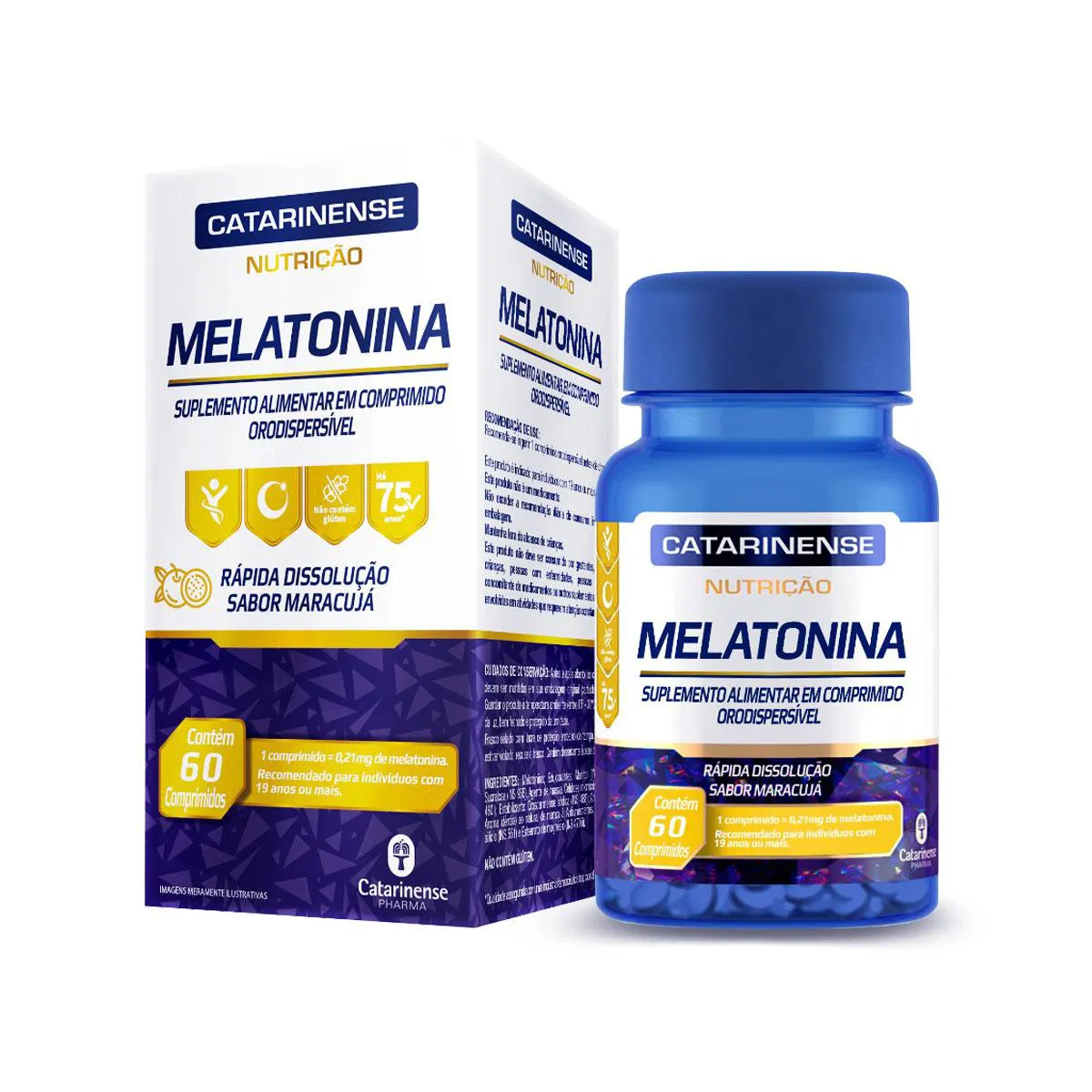 MARACUJÁ: Melatonina; Edulcorantes: Manitol (INS 421) e Sucralose (INS 955), Agente de massa: Celulose microcristalina (INS 460i); Estabilizante: Croscarmelose sódica (INS 468); Aromatizante: Aroma idêntico ao natural de maracujá; Antiumectantes: Dióxido de silício (INS 551) e Estearato de magnésio (INS 470iii).Categoria de alimento dispensado de registro conforme Resolução RDC 27/2010.Consulte as advertências e a recomendação de uso constante no rótulo do produto. Imagens meramente ilustrativas. Material destinado ao uso exclusivo por profissionais da área de saúde. Contém aromatizante sintético idêntico ao natural.