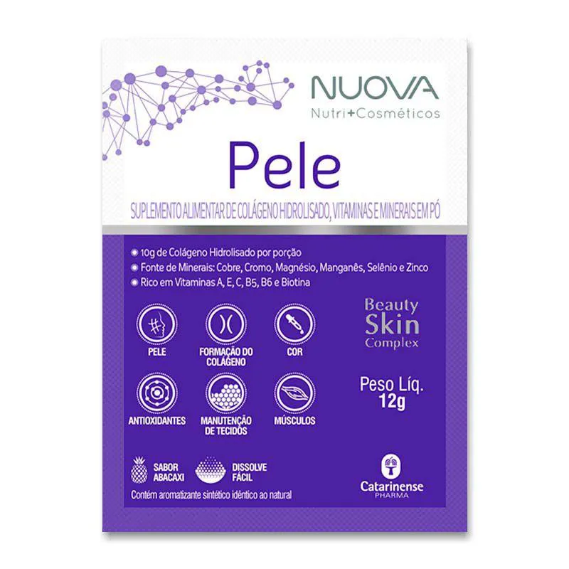 Kit 3 Nuova Pele colágeno Hidrolisado Catarinense Abacaxi Nuova Pele (Beauty Skin Complex) possui 10g de Colágeno Hidrolisado por porção e possui 12 nutrientes. É fonte das vitaminas: A, E, C, B5, B6 e Biotina, atendendo 100% da IDR (Ingestão Diária Recomendada).