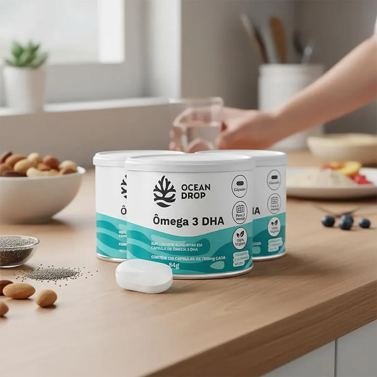 Kit 3 Ômega 3 DHA Vegano Ocean Drop 120 Cápsulas + Porta Cápsulas Modo de uso: