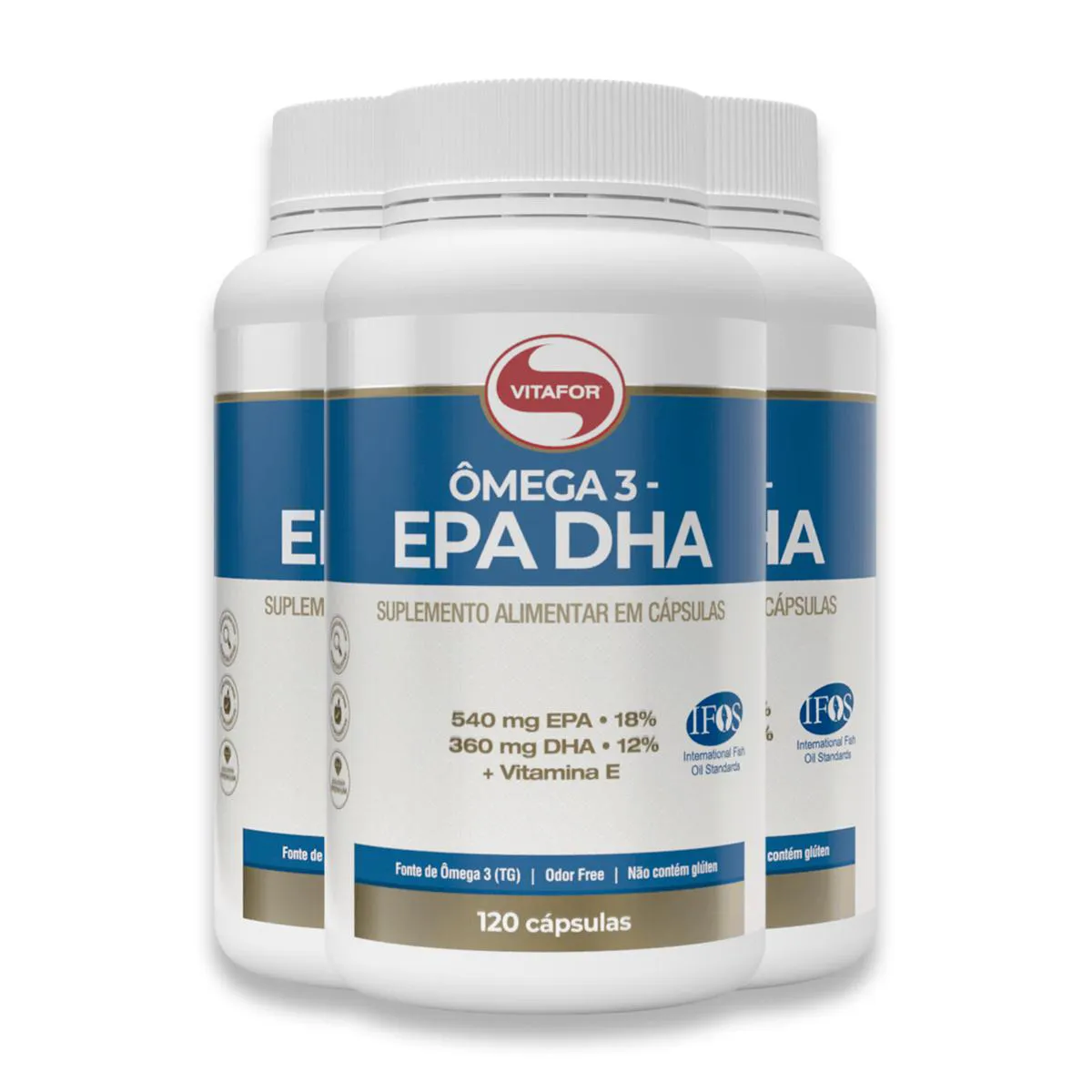 O Kit 3 Ômega 3 EPA DHA Vitafor é um suplemento alimentar à base de óleo de peixe, rico em ácidos graxos ômega 3, especificamente EPA e DHA, com adição de vitamina e. Seu objetivo principal é fornecer nutrientes essenciais para o organismo, contribuindo para a saúde geral, com destaque para a certificação internacional de qualidade IFOS™ e o selo VLabor.
