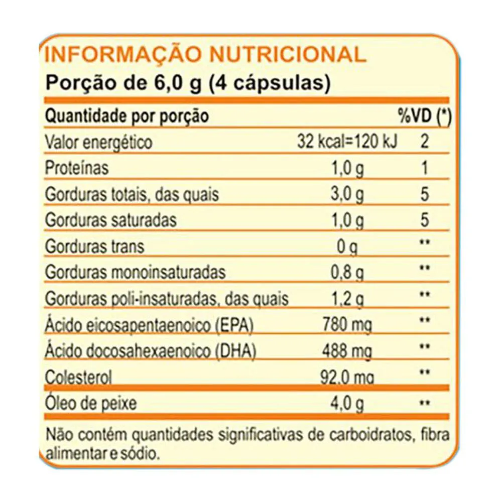 • Fonte de gorduras boas que devem ser consumidas por meio da alimentação. • O consumo de ômega 3 é incentivado pela Sociedade Brasileira de Cardiologia. • Protege a saúde do coração. • Reduz a quantidade de triglicerídeos circulantes. • Promove a redução do colesterol ruim ( LDL ) e aumento do bom ( HDL ). • Protege e prolonga a vida dos neurônios. • Propriedades anti-inflamatórias. INFORMAÇÃO NUTRICIONAL