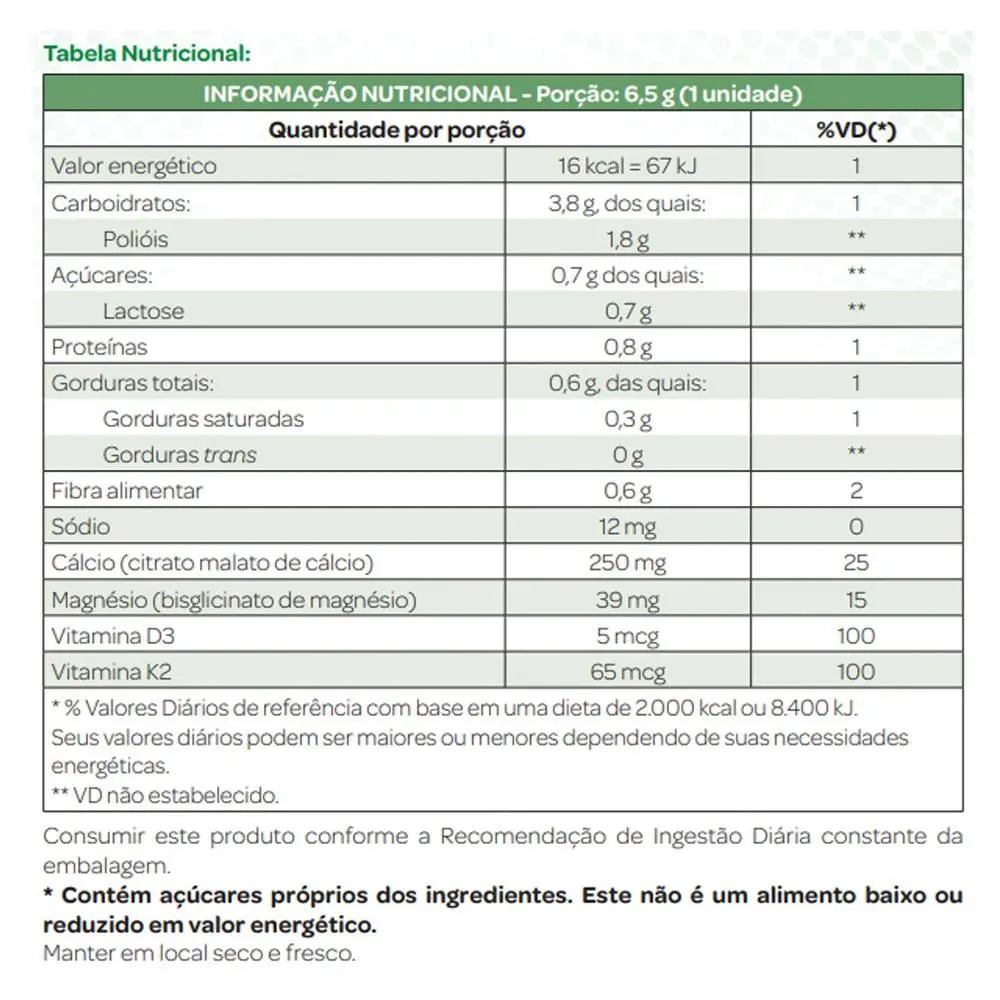 - Suplemento com cálcio, magnésio, vitaminas D3 e K2.