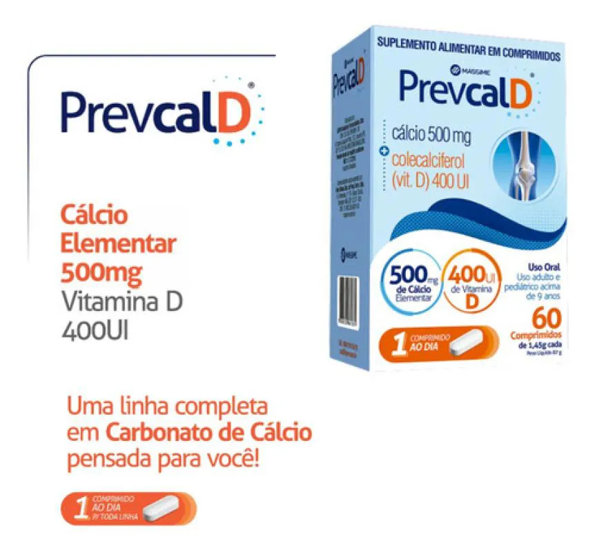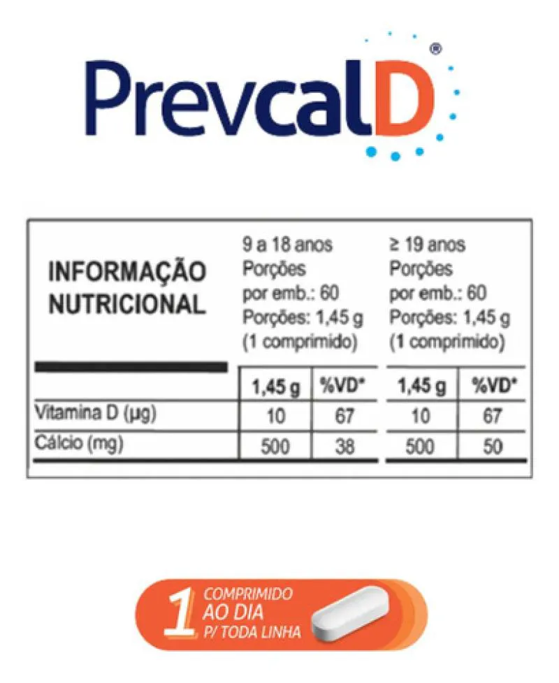 O Prevcal D é um suplemento alimentar desenvolvido para contribuir com a saúde óssea e a manutenção de níveis adequados de cálcio e vitamina d no organismo. Cada comprimido fornece 500mg de cálcio elemental e 400UI de colecalciferol (vitamina D3), combinação essencial para fortalecer ossos e dentes, prevenir a osteoporose e melhorar a absorção de cálcio.