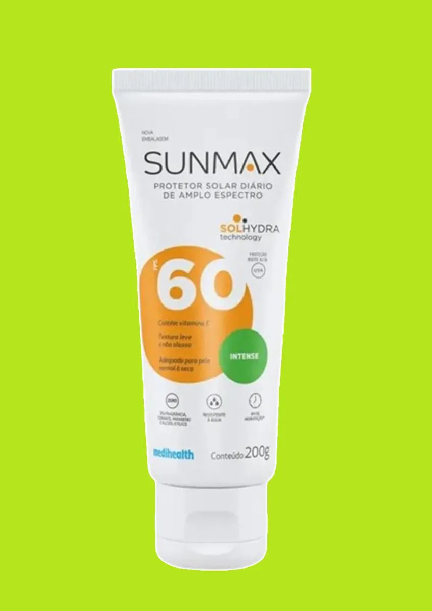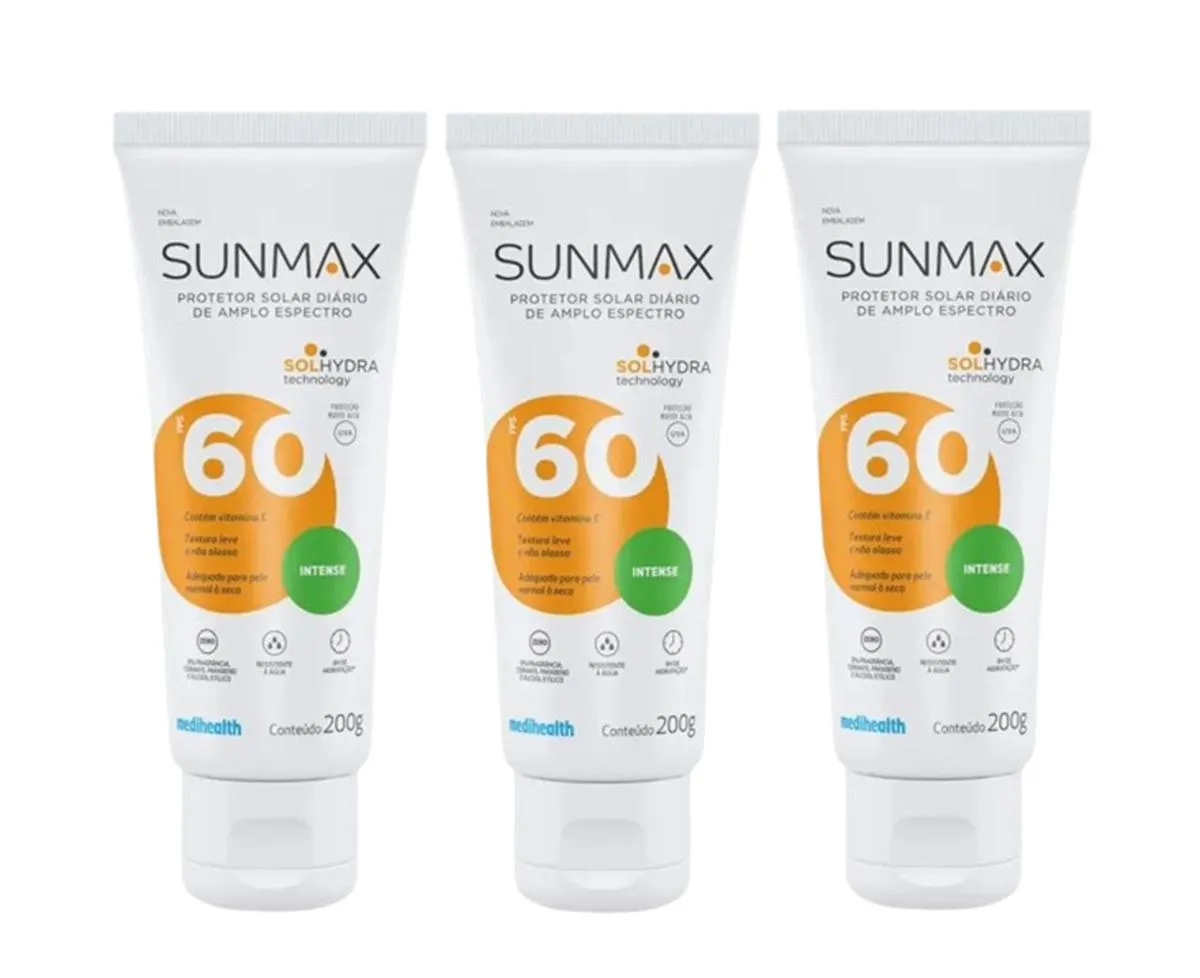 O Kit 3 Protetor Solar Sunmax Intense Fps60 200G é um protetor solar corporal desenvolvido especificamente para pele normal a seca, com alta proteção solar FPS 60 e proteção UVA 20. O produto utiliza a tecnologia SOLhydra, que proporciona hidratação prolongada por até 8 horas, protegendo a pele contra queimaduras solares, vermelhidão e fotoenvelhecimento.