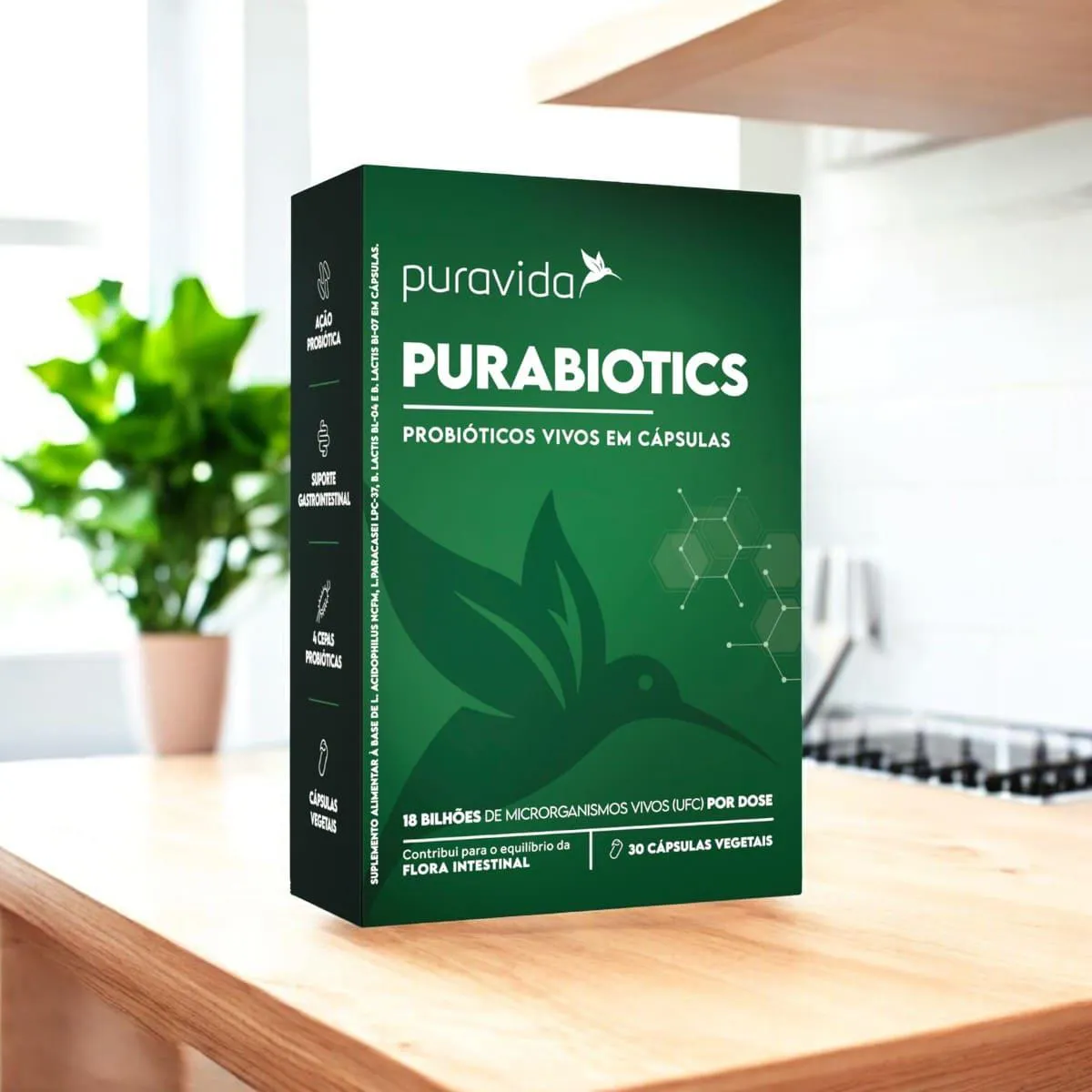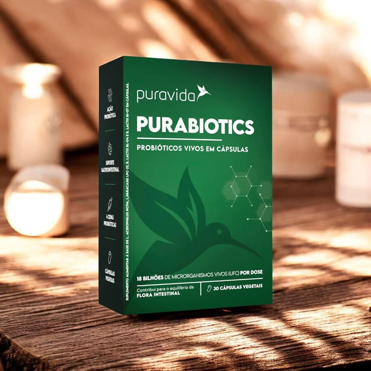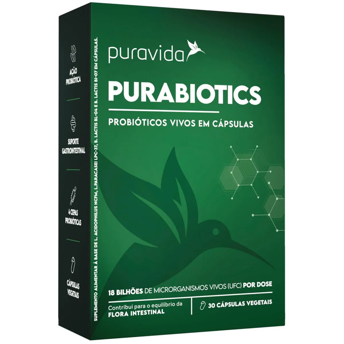 Purabiotics da Puravida é um suplemento alimentar premium formulado para promover o equilíbrio da microbiota intestinal e fortalecer as defesas naturais do organismo. Cada dose contém 18 bilhões de microrganismos vivos, provenientes de quatro espécies probióticas cuidadosamente selecionadas, encapsulados em cápsulas vegetais gastrorresistentes que garantem a chegada dos probióticos vivos ao intestino, onde exercem sua função pró-saúde. Composição: Lactobacillus acidophilus NCFM (ATCC SD5221), Lactobacillus paracasei Lpc-37 (ATCC SD5275), Bifidobacterium animalis subsp. lactis Bl-04 (ATCC SD5219), Bifidobacterium animalis subsp. lactis Bi-07 (ATCC SD5220), Agente de massa: celulose microcristalina, Antiumectantes: estearato de magnésio e dióxido de silício.Cápsula: espessante hidroxipropilmetilcelulose.