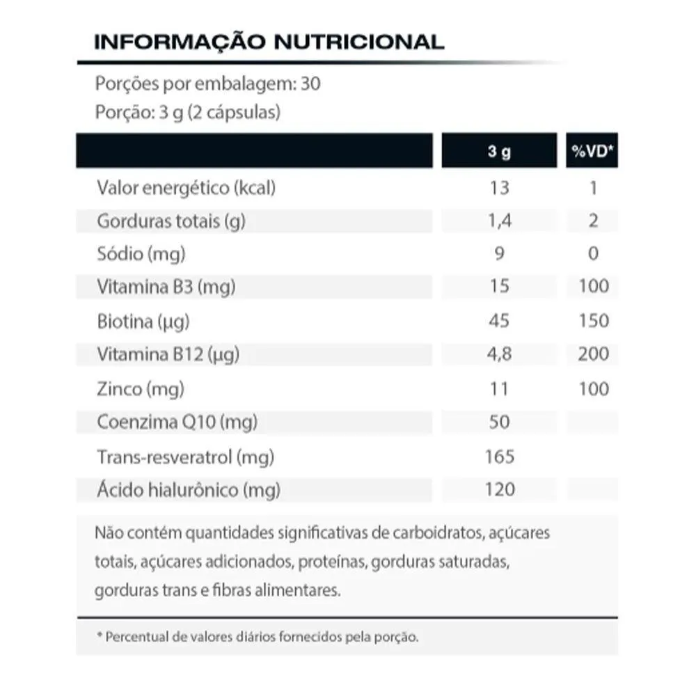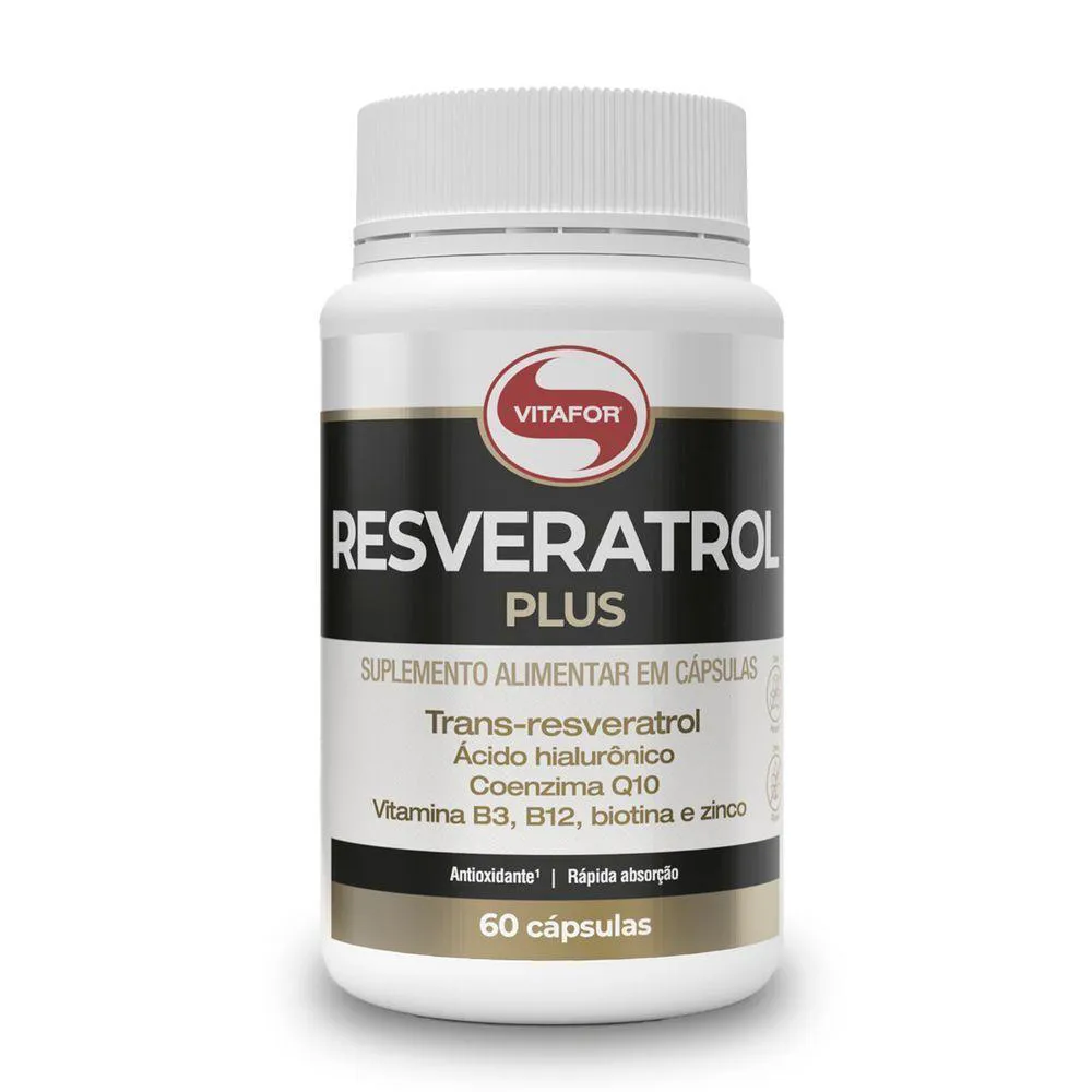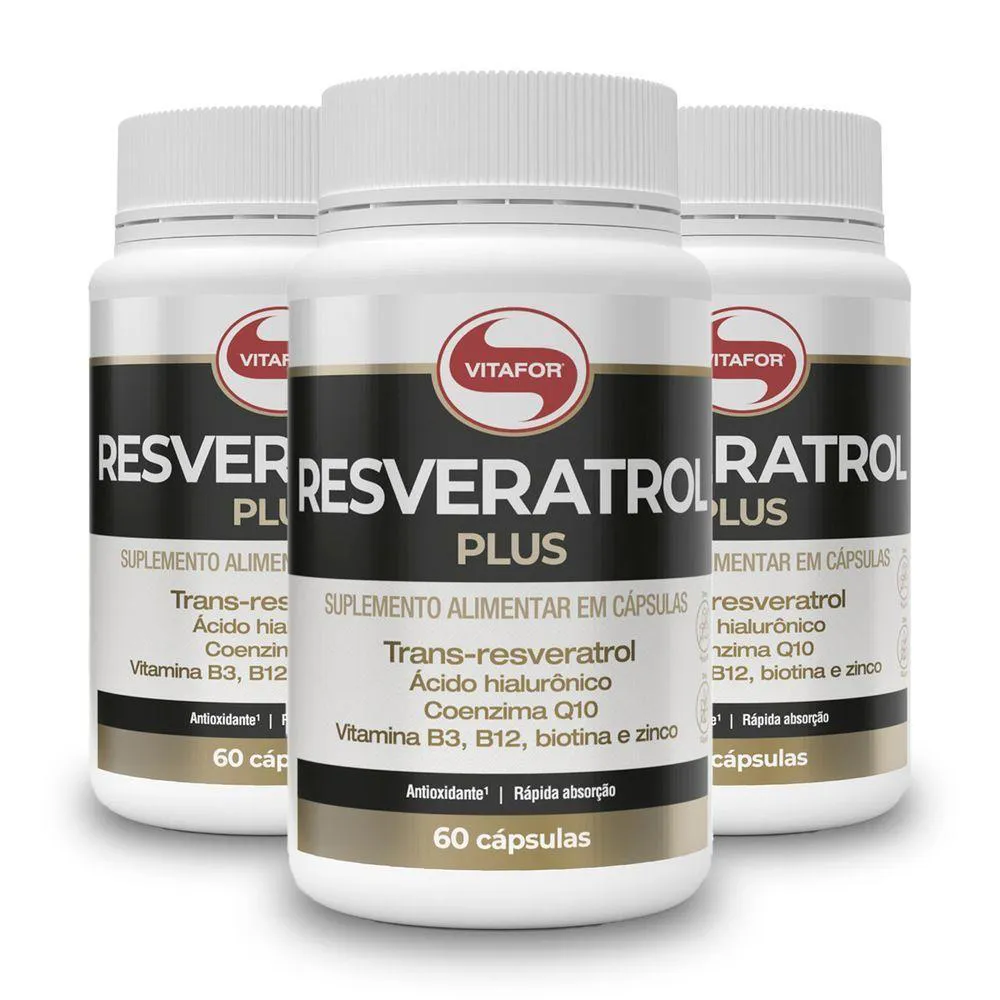 Kit 3 Resveratrol Plus Vitafor 60 CápsulasSobre o produtoRESVERATROL PLUS é um suplemento alimentar a base de óleo de semente de uva (Vitis vinifera L.), trans-resveratrol, ácido hialurônico, coenzima Q10, vitaminas B3, B12, biotina e zinco.Benefícios- A vitamina B3 contribui para a manutenção da pele, a biotina contribui para a manutenção do cabelo e da pele e o zinco contribui para a manutenção do cabelo, da pele e das unhas;- As vitaminas B3 e B12, a biotina e o zinco auxiliam no metabolismo de proteínas, carboidratos e gorduras;- O zinco e a vitamina B12 auxiliam no processo de divisão celular e no funcionamento do sistema imune;- As vitaminas B3 e B12 e a biotina auxiliam no metabolismo energético;- A vitamina B3 e a biotina auxiliam na manutenção de mucosas;- O zinco é um antioxidante que auxilia na proteção dos danos causados pelos radicais livres, na visão, no metabolismo da vitamina A, na síntese de proteínas e na manutenção de ossos.Modo de usarSuplemento alimentar de uso adulto (a partir de 19 anos de idade): ingerir 3 g (2 cápsulas) ao dia antes das refeições ou seguir a recomendação de um prossional da saúde.IngredientesÓleo de semente de uva (Vitis vinifera L.), trans-resveratrol sintético, hialuronato de sódio obtido da fermentação de Streptococcus zoopidemicus, bisglicinato de zinco (zinco), niacinamida (vitamina B3), metilcobalamina (vitamina B12), D-biotina (vitamina B7), corante natural urucum e antiumectante dióxido de silício. Composição da cápsula: gelatina, água puricada e umectante glicerina.AlergênicosCONTÉM DERIVADOS DE SOJA. NÃO CONTÉM GLUTÉN.
