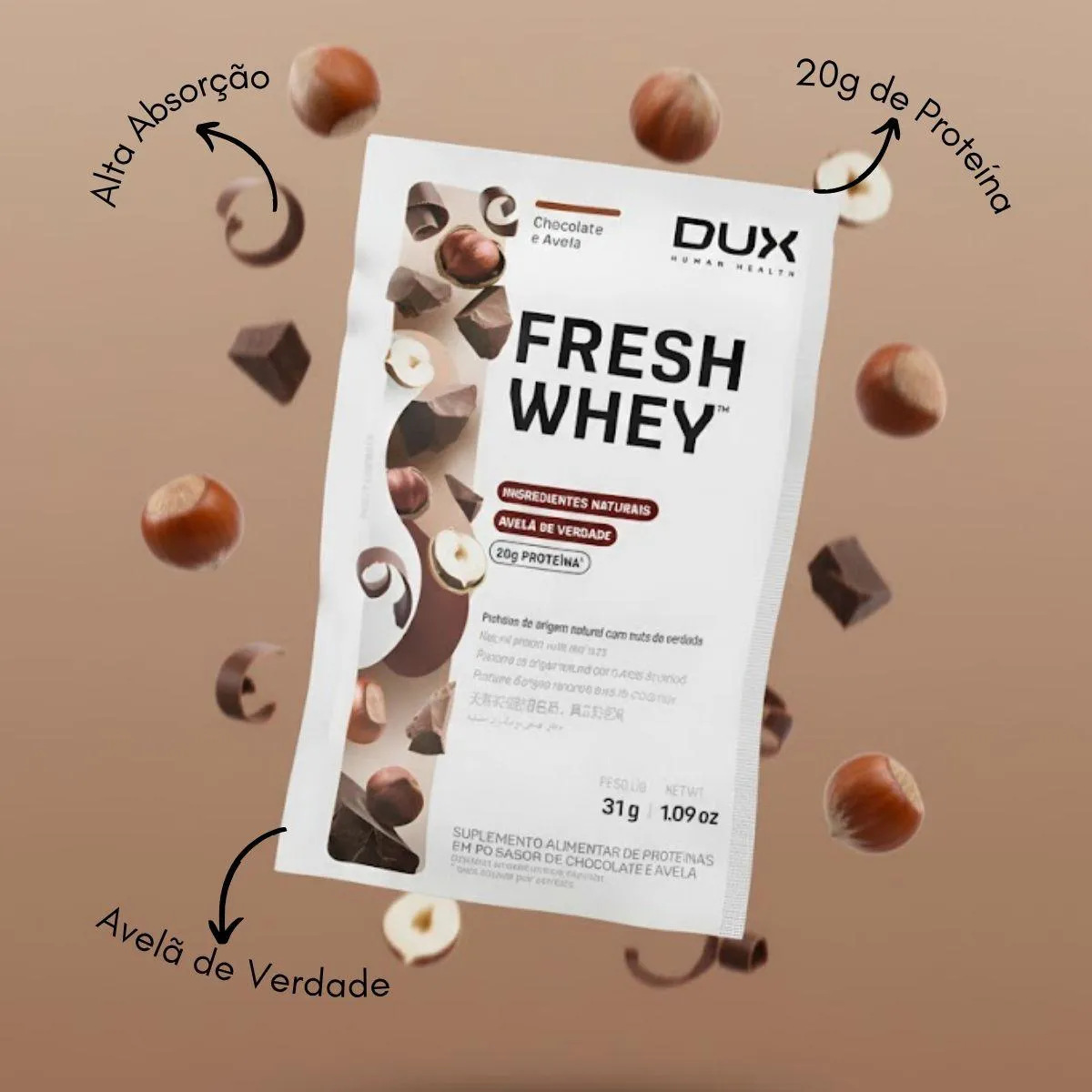 O produto é um suplemento proteico em sachês, composto por um blend de whey protein (concentrado, isolado e hidrolisado) com sabor de chocolate belga e avelã. Cada sachê contém 31g e fornece 20g de proteína, sendo desenvolvido para auxiliar atletas e praticantes de atividade física na nutrição e recuperação muscular.