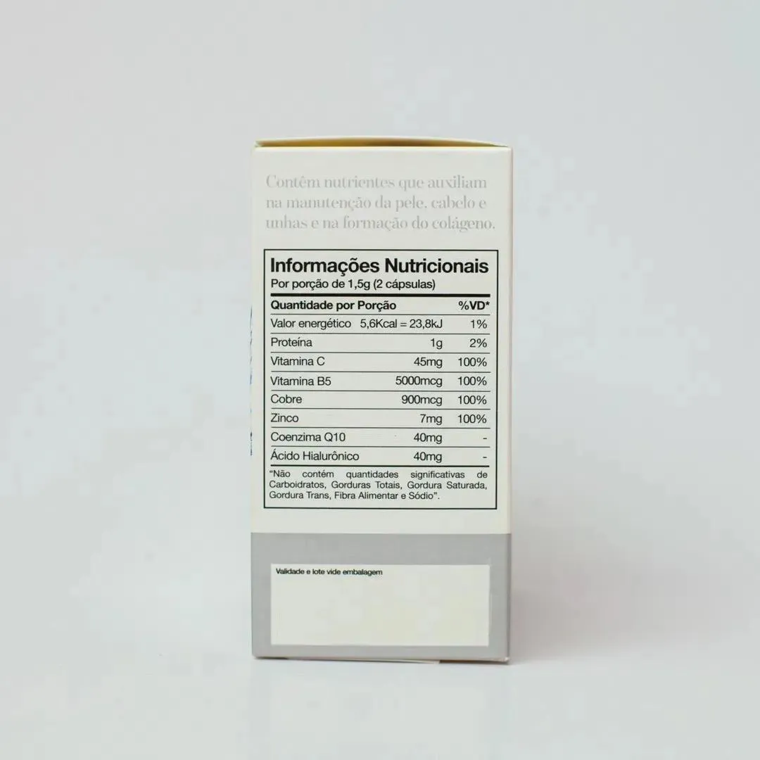 Colágeno hidrolisado: mantém a pele hidratada, melhora as fibras de sustentação da pele, elasticidade, firmeza e diminui flacidez.