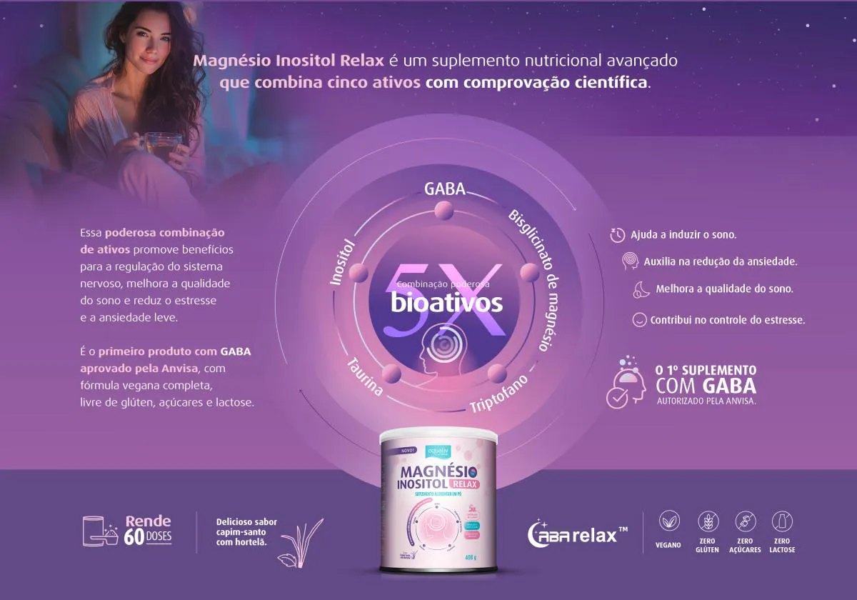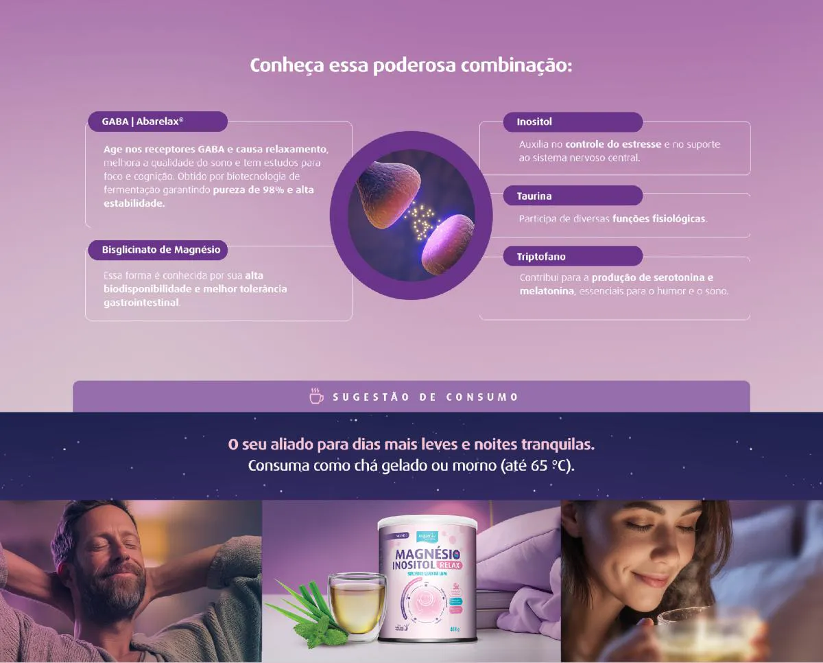 Kit 3 Suplemento Equaliv Magnésio Inositol Relax Gaba 408g Uma nutrição equilibrada tem um papel muito importante na qualidade de vida. Com o ritmo acelerado de muitas pessoas, às vezes, é muito difícil prestar atenção a todos os requisitos que o corpo precisa para estar saudável e forte. Neste sentido, os suplementos cumprem a função de complementar a alimentação e ajudam a obter as vitaminas, minerais, proteínas e outros componentes indispensáveis para o correto funcionamento do organismo. Para uma dieta balanceada e uma atividade física de alta intensidade. Pode ser usado para prevenir deficiências alimentares causadas por alguma patologia ou circunstância específica, além de colaborar com a saúde e o bem-estar geral. Sua fórmula exclusiva reúne magnésio bisglicinato, GABA (Abarelax™), inositol, taurina, triptofano e extrato de semente de uva.