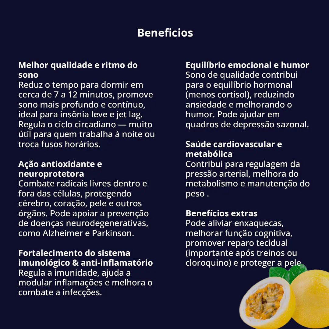 - Regulador fisiológico do ritmo circadiano (dia‑noite), facilitando a transição para o sonoModo de uso sugerido: