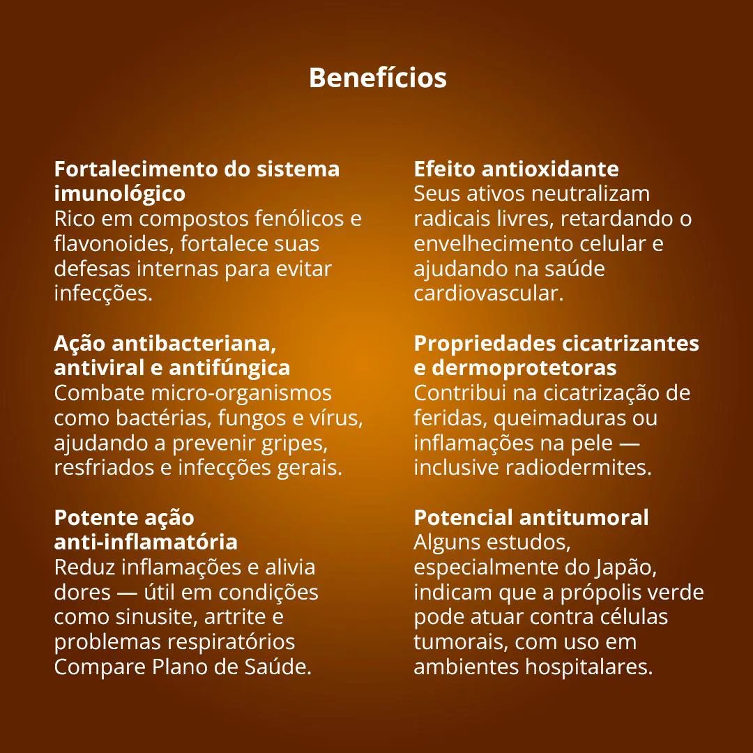 - Suplemento alimentar natural com extrato de própolis verde de origem vegetal.