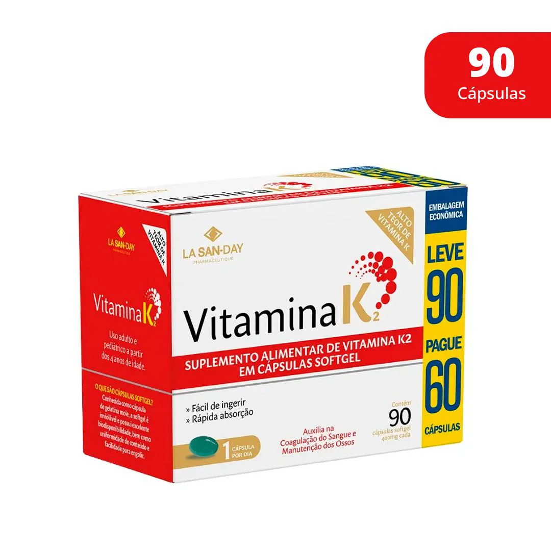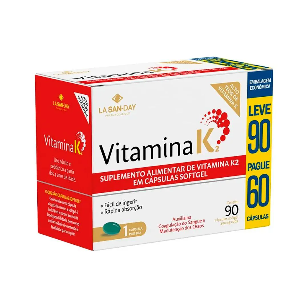 O produto é um suplemento alimentar de Vitamina K2 (MK-7) em formato de cápsulas, desenvolvido pela marca La San-Day. Fornece menaquinona-7, uma forma altamente biodisponível de vitamina K2 que atua no organismo com meia-vida prolongada. Serve para ativar proteínas essenciais relacionadas ao metabolismo do cálcio, favorecendo a deposição adequada de cálcio na matriz óssea, contribuindo para o equilíbrio do sistema ósseo e vascular, especialmente para adultos com baixa ingestão alimentar de vitamina K2.