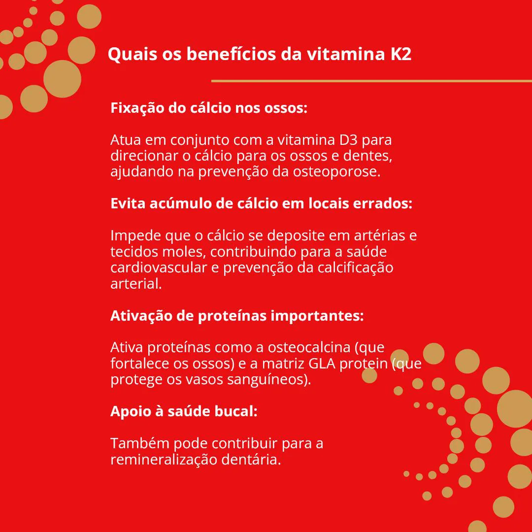 - Forma altamente biodisponível de vitamina K2 com meia-vida prolongada no organismo.