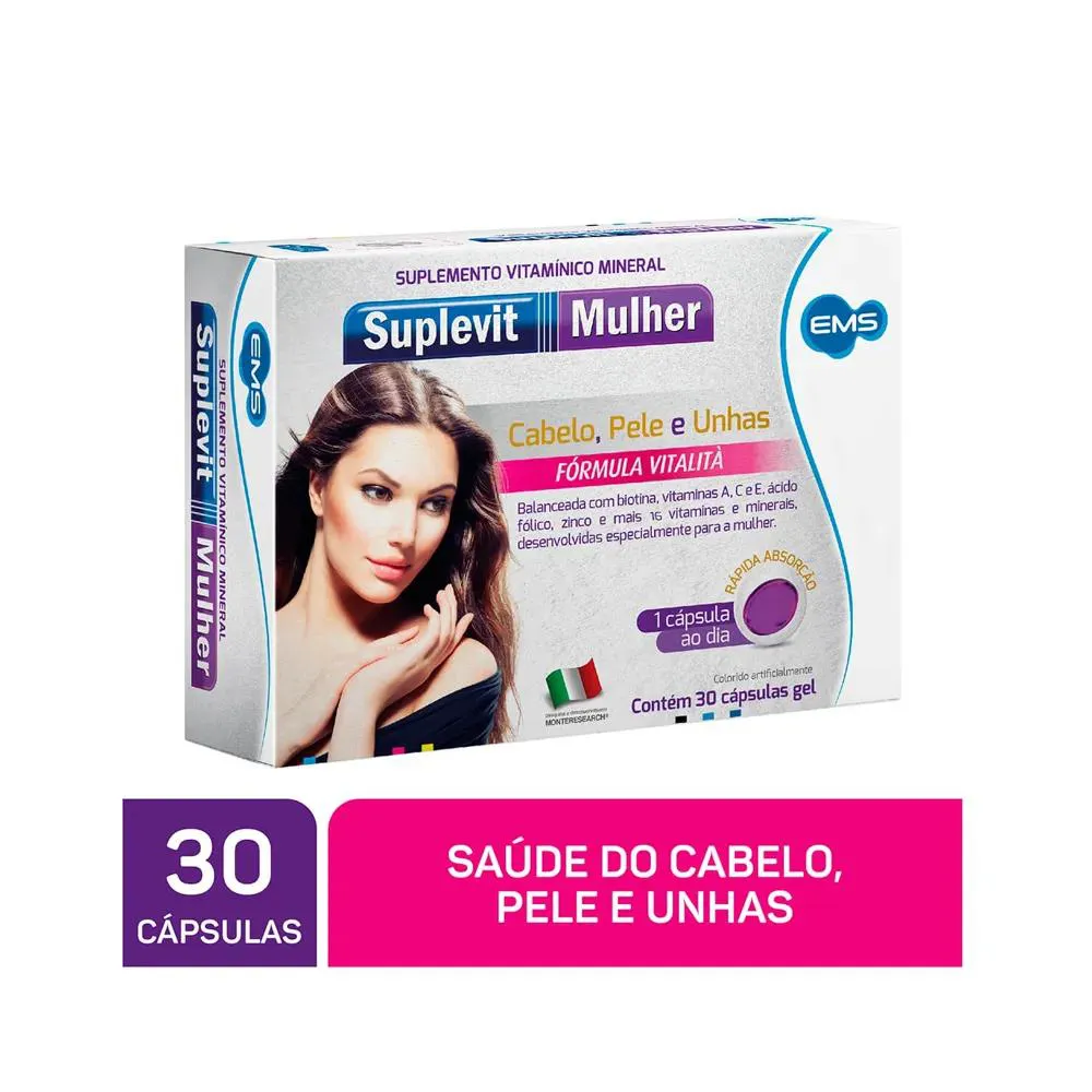 Kit 3 Suplemento Suplevit Mulher Cabelos e Unhas 30 cápsulas – SEM Formulado na Itália pelo Instituto Monte Research, Suplevit Mulher é o aliado ideal para a beleza feminina de pele, unhas e cabelos. Balanceado com Biotina, Vitaminas A e E, Ácido Fólico e Zinco, Suplevit mulher conta ao todo com 23 vitaminas e minerais desenvolvidas especialmente para a mulher. Suplevit Mulher te ajuda a ter disposição e cuida do seu sistema imune para aguentar a rotina corrida, além de manter a saúde do cabelo, pele e unhas em dia. MODO DE USO: Tomar 1 Cápsula ao dia com ajuda de água, ou seguir recomendação de um profissional da saúde. COMPOSIÇÃO: Óleo de soja, óleo de linhaça, óxido de magnésio, ácido ascórbico, fumarato ferroso, nicotinamida, acetato de racealfatocoferol, óxido de zinco, D-pantotenato de cálcio, sulfato de manganês, cloridrato de piridoxina, nitrato de tiamina, palmitato de retinol, riboflavina, óxido de cobre, selenito de sódio, ácido fólico, vitamina D3 (colecalciferol), cloreto crômico hexaidratado, fitomenadiona, molibdato de sódio diitratado, iodeto de potássio, D-biotina, cianocobalamina, entre outros. NÃO CONTÉM GLÚTEN. ALÉRGICOS: CONTÉM DERIVADOS DE AMENDOIM E SOJA E PODE CONTER DERIVADOS DE PEIXE. ATENÇÃO: GESTANTES, LACTANTES E CRIANÇAS DE ATÉ 3 ANOS SOMENTE DEVEM CONSUMIR ESTE PRODUTO SOB A ORIENTAÇÃO DE UM MÉDICO OU NUTRICIONISTA. SOBRE A LOJA: Somos a rede de farmácias mais antiga de São José dos Pinhais, atuando no ramo farmacêutico desde 1990 com comprometimento à qualidade e satisfação do cliente. É um prazer compartilhar os nossos valores e as nossas conquistas com quem confia no nosso trabalho! Imagens dos Produtos são Meramente Ilustrativas. Todas as Informações Divulgadas são de Responsabilidade Exclusiva do Fabricante/fornecedor.