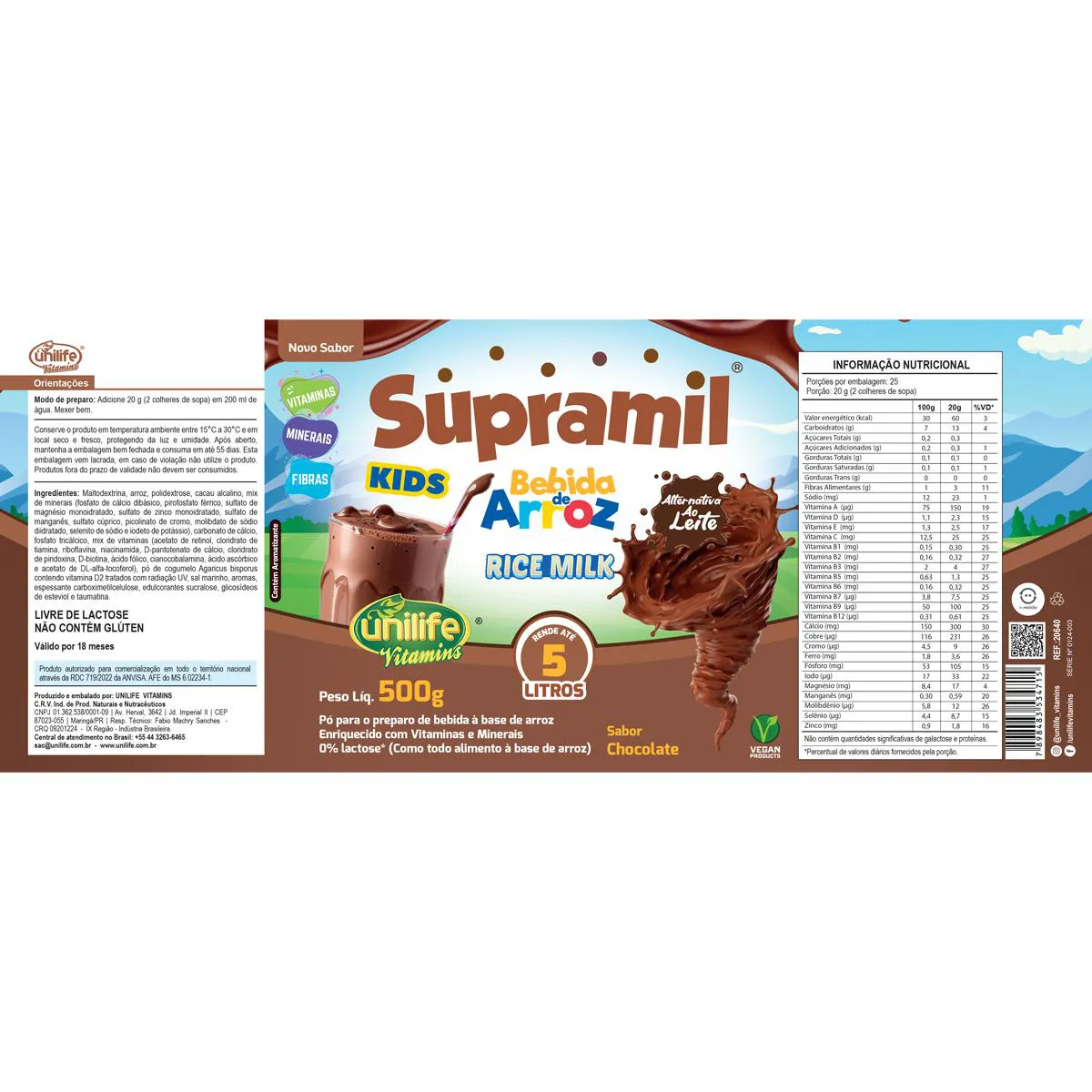 Kit 3 Supramil Bebida de Arroz Kids chocolate Unilife 500g A Bebida de Arroz é uma ótima alternativa ao leite comum, especialmente para pessoas com intolerância alimentar. Rica em vitaminas, fibras e minerais. Indicado para substituição pelos leites vegetais (enriquecidos com cálcio e vitaminas). O leite de arroz é um dos melhores substitutos, principalmente a sua versão em pó, já que, além de enriquecida, também pode substituir o leite em receitas diversas, doces ou salgadas. Benefícios É enriquecida com vitaminas (vitamina c, vitamina D2 e vitamina k) fibras e minerais como o cálcio. Modo de usar Adicione 2 colheres de sopa em 200ml de água. Mexer bem. Ingredientes Arroz, polidextrose, carbonato de cálcio, menaquinona (MK-7) (vitamina K2), ácido ascórbico (vitamina C), ergocalciferol, aroma natural de baunilha, antiumectante fosfato tricálcico, edulcorante sucralose, edulcorantes naturais, glicosídeos de steviol e taumatina, sal marinho. Alergênicos NÃO CONTÉM GLÚTEN. Código Anvisa Produto autorizado para comercialização em todo o território nacional através da RDC 719/2022 da ANVISA. AFE do MS 6.02234-1