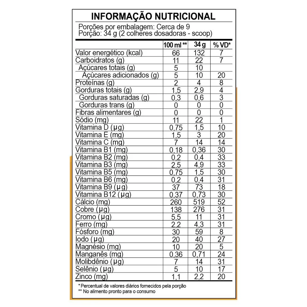 Farinha de arroz, fibra de soja, aroma idêntico ao natural de baunilha, fosfato tricálcico, cloreto de potássio, pirofosfato férrico, vitaminas (C, E, D3, A, B1, B2, B3, B5, B6, B9, B12, H) e minerais (zinco, ferro, selênio, iodo). Informações Importantes