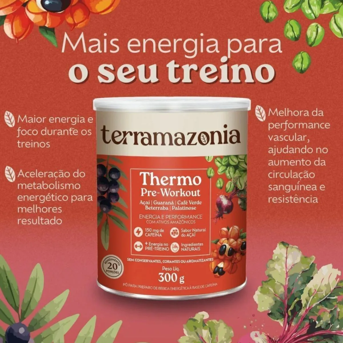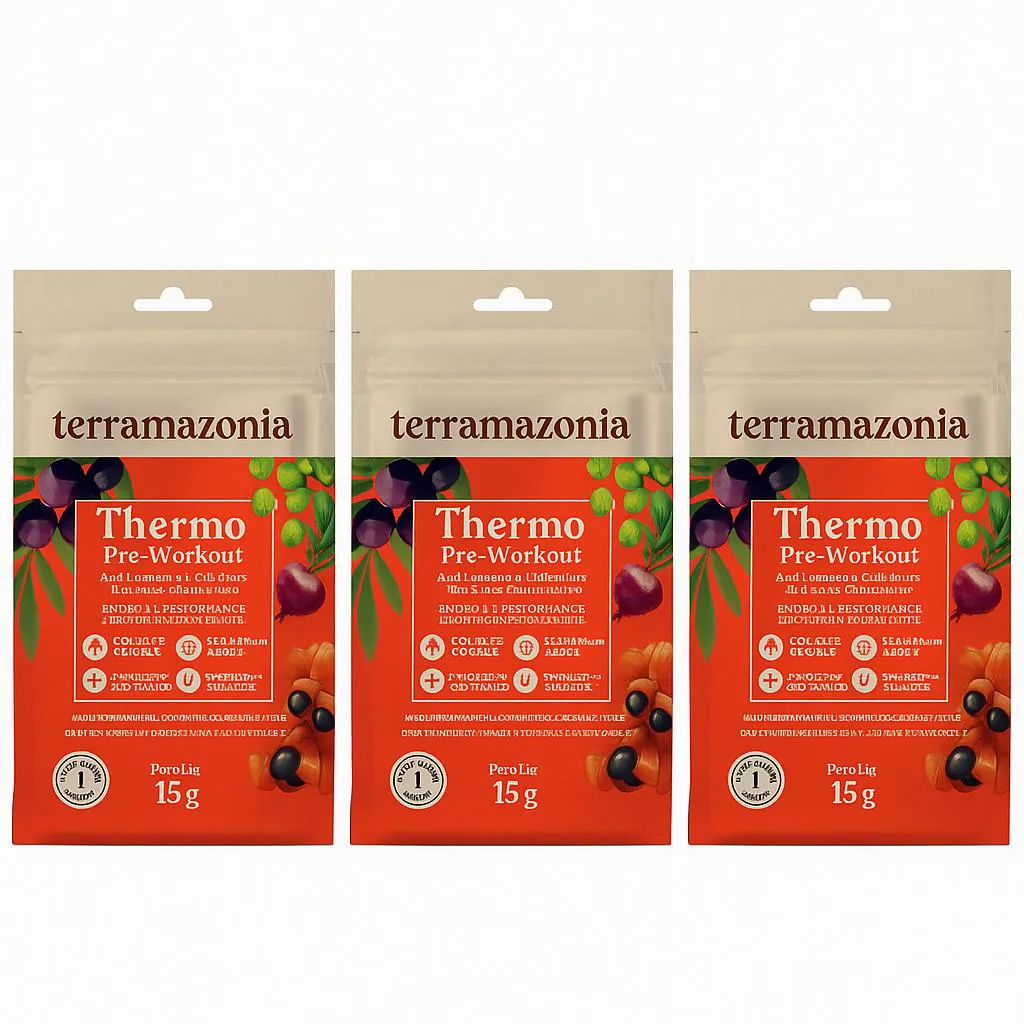 KIT 3 - Ativos naturais da Amazônia O Thermo Pre-Workout foi formulado para quem busca uma energia duradoura e performance otimizada durante os treinos. Com ingredientes naturais como açaí, guaraná, café verde, beterraba e palatinose, ele oferece um impulso extra para melhorar o desempenho, aumentar a resistência e otimizar o foco. Com 150mg de cafeína e sem adição de corantes, conservantes ou aromatizantes, o Thermo Pre-Workout é a escolha ideal para quem deseja resultados naturais e potentes. Prepare-se para atingir seus objetivos mais rápido e com mais disposição! Benefícios: Maior energia e foco durante os treinos; Melhora da performance vascular, ajudando no aumento da circulação sanguínea e resistência; Aceleração do metabolismo energético para melhores resultados; Sabor natural do açaí, sem adição de aromatizantes artificiais; Sustentação de energia ao longo de atividades de alta intensidade; Apoio antioxidante para recuperação pós-treino e proteção contra os danos do estresse físico. Ingredientes: Açaí em Pó: Rico em antioxidantes, o açaí ajuda a proteger as células contra os danos causados pelos radicais livres. Sua presença no Thermo Pre-Workout também contribui para o sabor único, além de oferecer energia sustentada e apoio ao sistema cardiovascular.