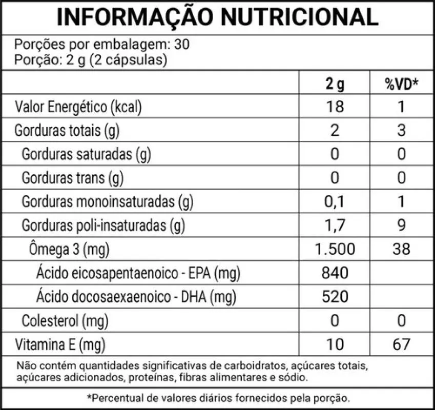Ingredientes ativos: óleo de peixe, DL‑alfa tocoferol (vitamina E)Composição da cápsula: gelatina, água purificada e umectante glicerina