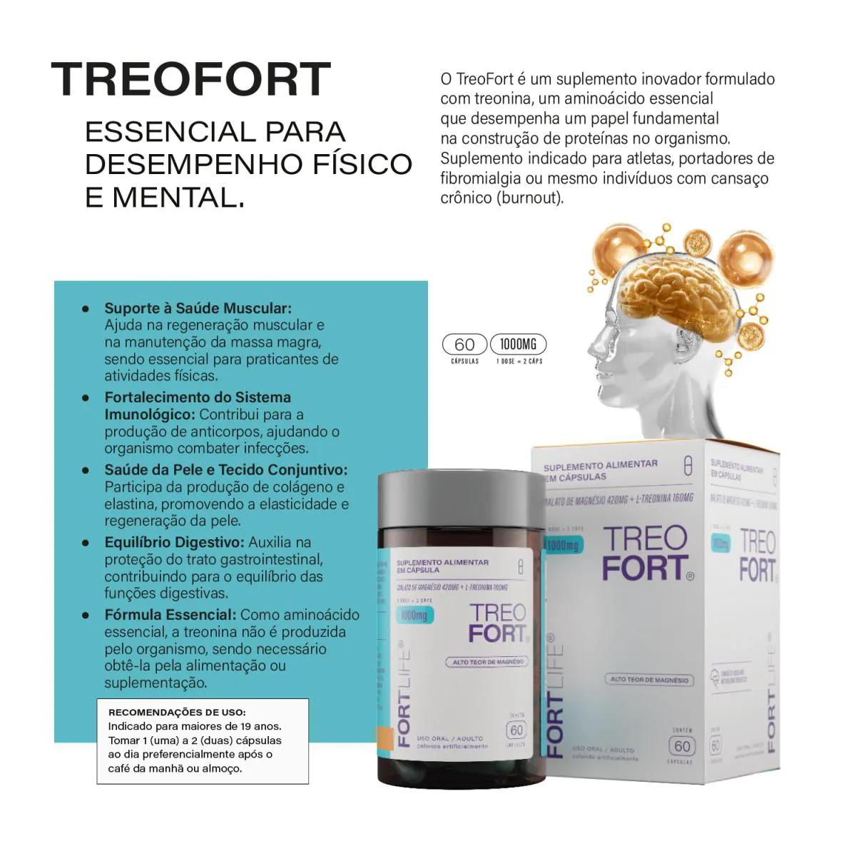 O TreoFort é um suplemento nutricional composto por cápsulas de treonina, um aminoácido essencial que não é produzido naturalmente pelo corpo humano. Desenvolvido para auxiliar no suporte nutricional e bem-estar geral, o produto é formulado para complementar a dieta de pessoas ativas e atletas. Cada kit contém 3 unidades de 60 cápsulas de 1000mg, oferecendo uma fonte concentrada deste importante aminoácido.