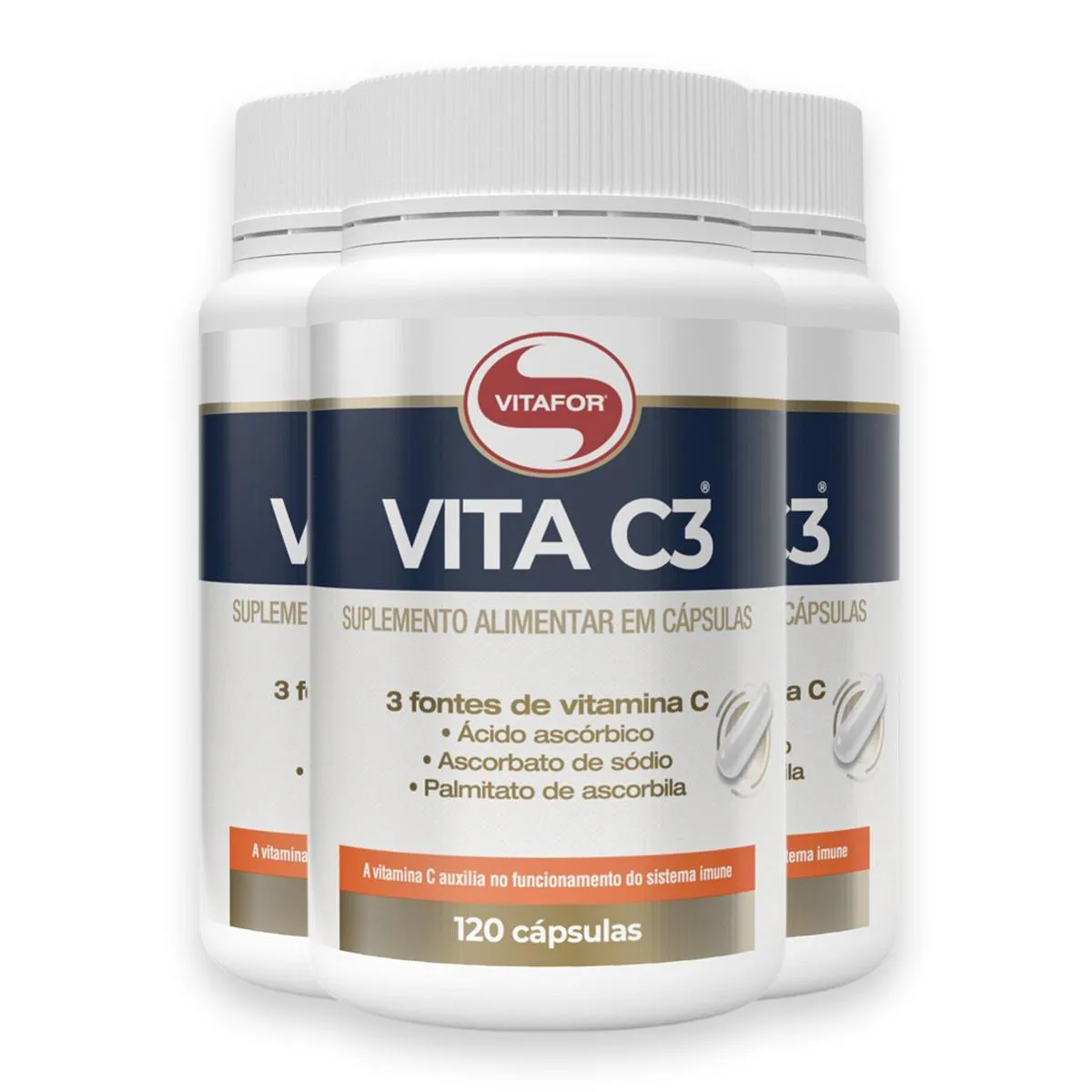Kit 3 Vita C3 vitamina c Vitafor 120 Cápsulas VITA C3 é um suplemento alimentar composto pela combinação de três diferentes fontes de vitamina C: ácido ascórbico, ascorbato de sódio e palmitato de ascorbila. Diferenciais: - Alto teor de Vitamina C por cápsula.