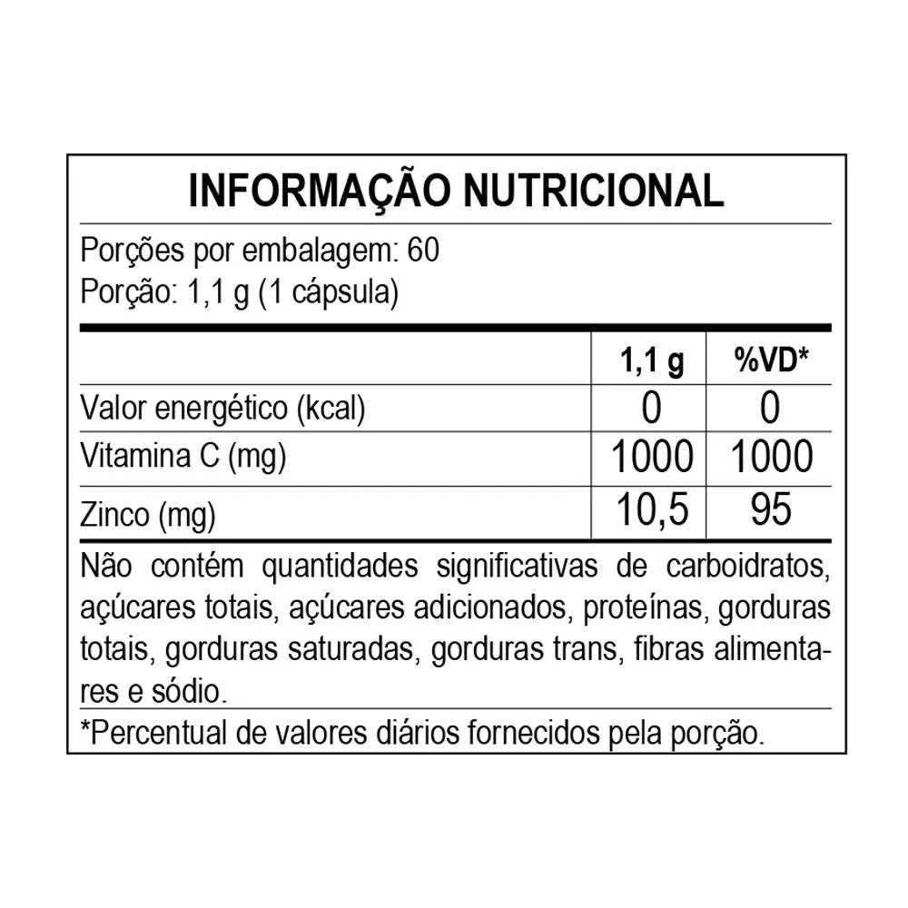 Ingredientes: Ácido ascórbico, bisglicinato de zinco e lubrificante talco. Cápsula: gelatina e água deionizada.