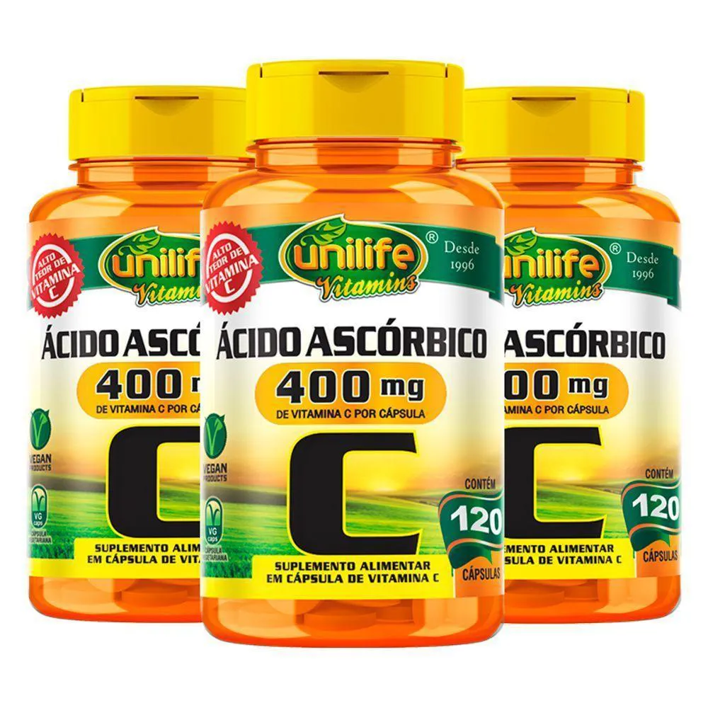 Kit 3 Vitamina C Ácido Ascórbico Unilife 120 Capsulas Veganas