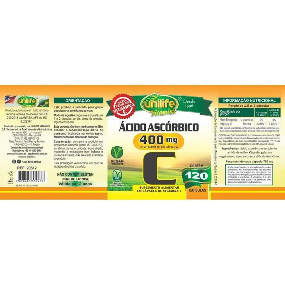 Kit 3 vitamina C Ácido Ascórbico Unilife 120 Capsulas VeganasSobre o produtoVITAMINA C 400 MG (Alto teor) Unilife Vitamins é um produto totalmente VEGANO Desenvolvido a partir de VITAMINA C, com cápsulas VEGETAIS (gelatina vegetal e água), o produto é livre de glúten.A VITAMINA C auxilia na absorção de ferro dos alimentos, é um antioxidante que auxilia na proteção dos danos causados pelos radicais livres, no funcionamento do sistema imune, na formação do colágeno, na regeneração da forma reduzida da vitamina e, no metabolismo energético e de proteínas e gorduras.Modo de usarSugere-se a ingestão de 1 a 2 cápsulas ao dia, após a refeição. Ingerir com líquido. Este produto não é um medicamento. Não excerder a recomendação diária de consumo indicada na embalagem. Mantenha fora do alcance de crianças.Ingredientesácido ascórbico (vitamina C)Peso total de cada cápsula: 750mg 400 mg de vitamina C por cápsula.