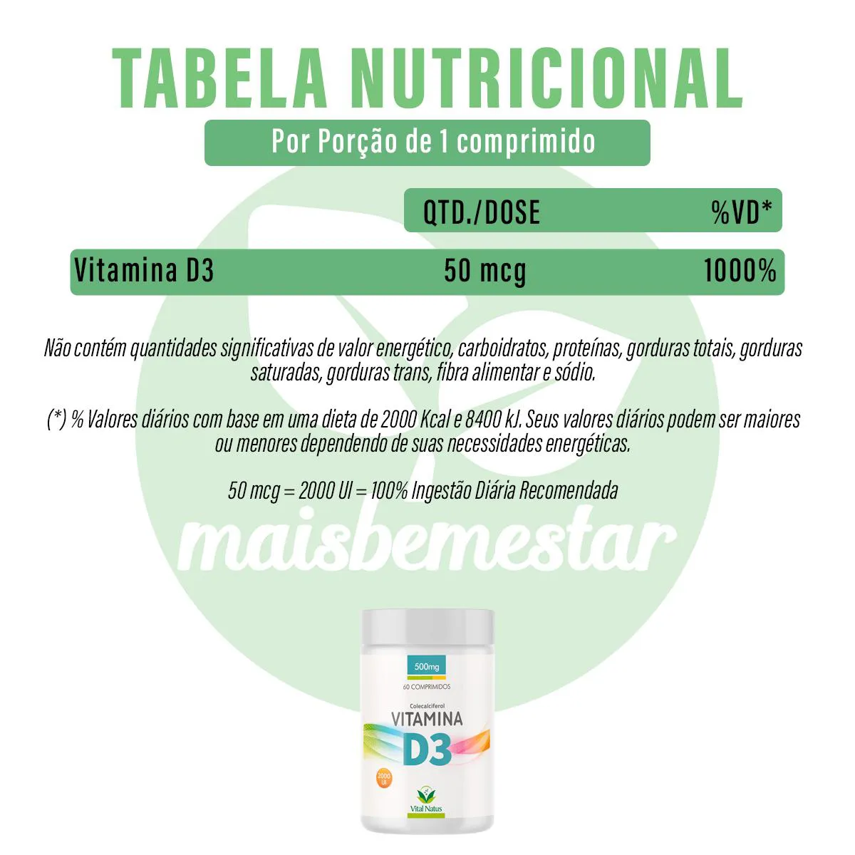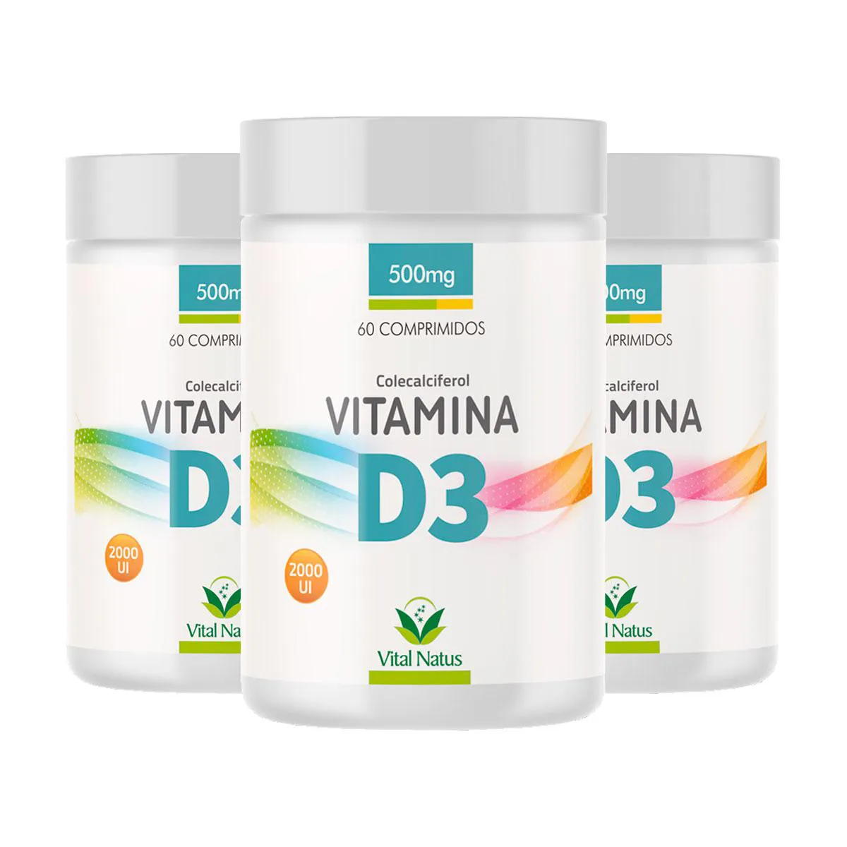 Nesta compra você receberá 3 frascos com 60 comprimidos de vitamina D3 2.000UI Vital Natus.