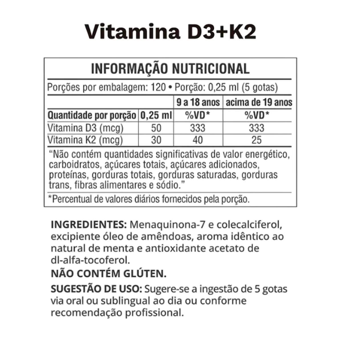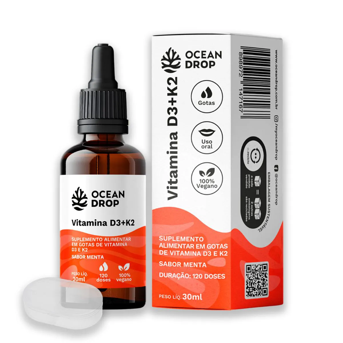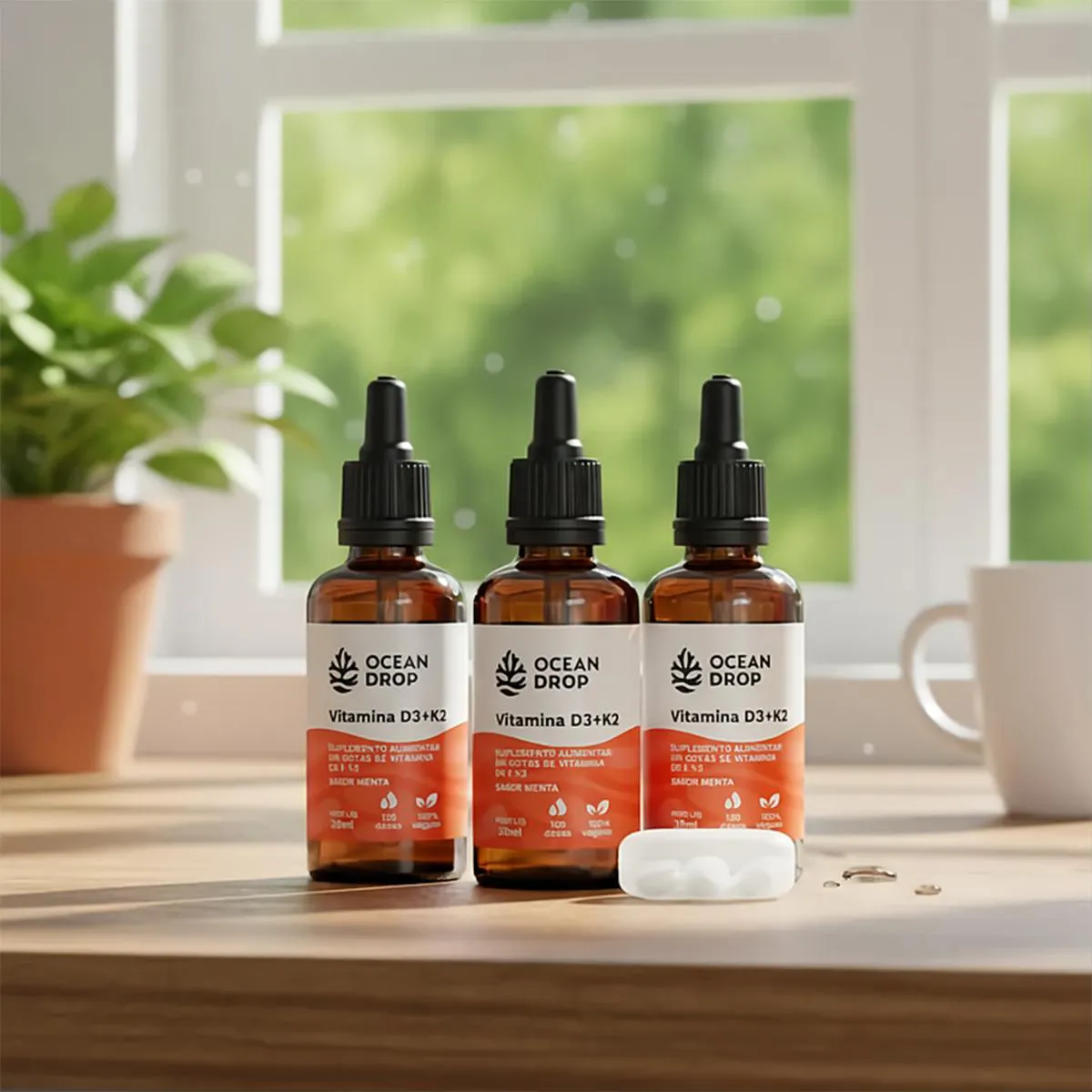 É um suplemento nutricional composto por vitaminas D3 e K2, apresentado em formato líquido com sabor de menta, acompanhado de um porta cápsulas. O produto é vegano, livre de glúten e de origem não animal.