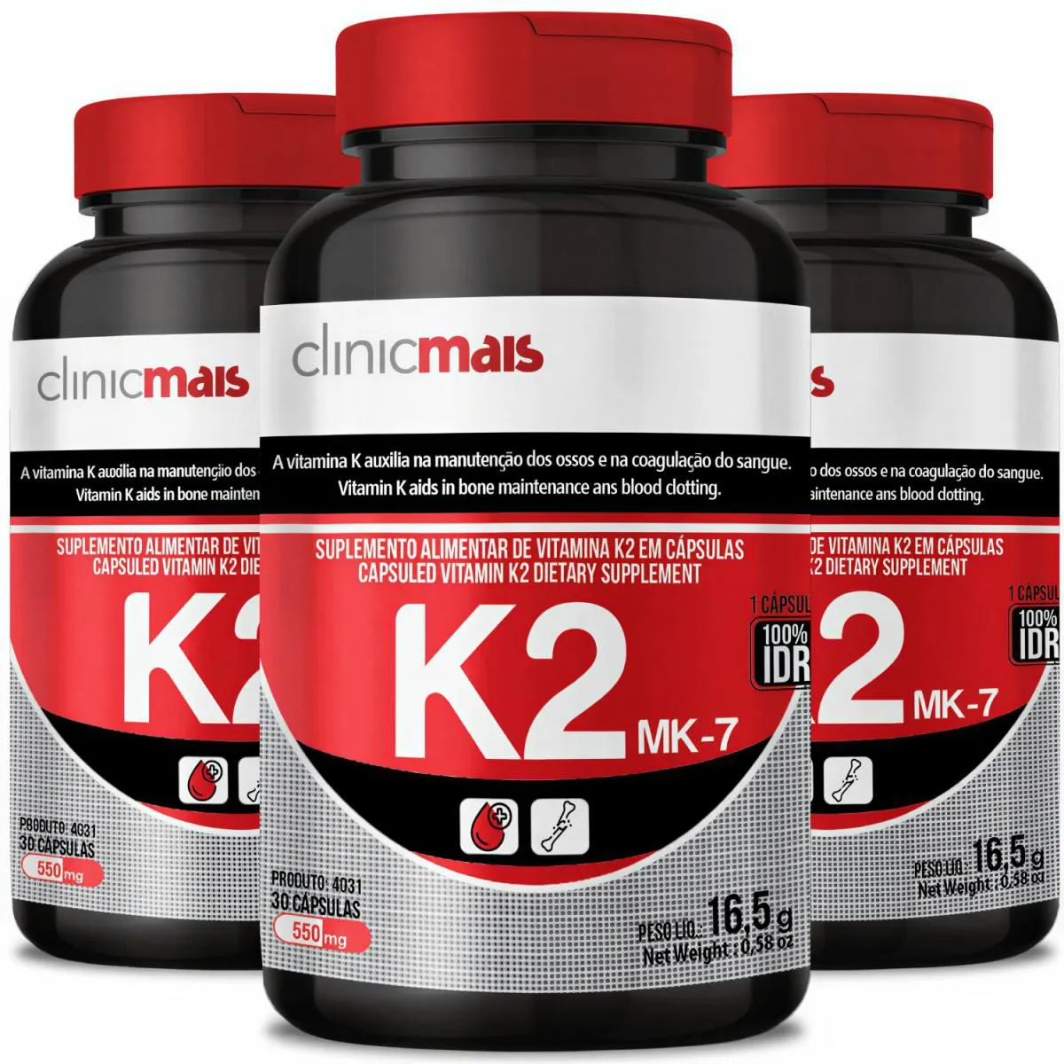 Kit 3 Vitamina K2 Menaquinona-7 Mk-7 65Mcg 1 ao Dia Total 90 Cápsulas - Clinicmais
