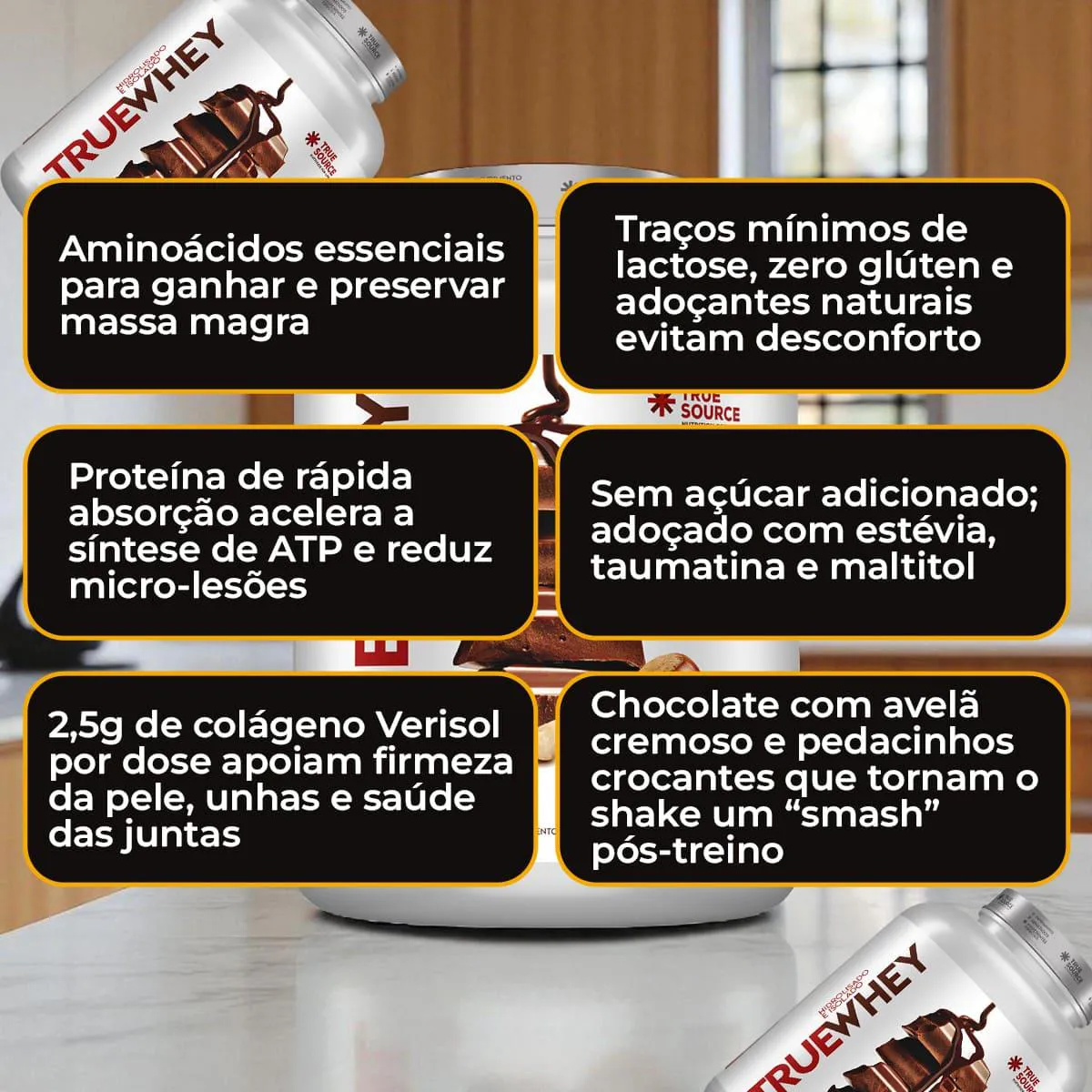 O True Whey Chocolate com Avelã 1,810g é um suplemento proteico “clean label” desenvolvido pela True Source. Ele combina proteínas do soro do leite nos formatos hidrolisado e isolado, oferecendo alta pureza e rápida absorção. A fórmula contém também colágeno Verisol® (2,5g por dose) e é adoçada com stevia, taumatina e maltitol, sem corantes ou adoçantes artificiais.