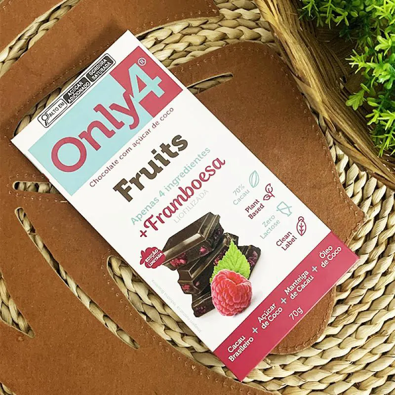 O Chocolate 70% Cacau com Framboesa Sem Lactose Vegano Only4 tem em sua composição base apenas 5 ingredientes, é indicada para pessoas que amam chocolates mais leves. Sem adoçantes ou açúcar refinado e mais suave comparado a outras marcas com o mesmo teor.
