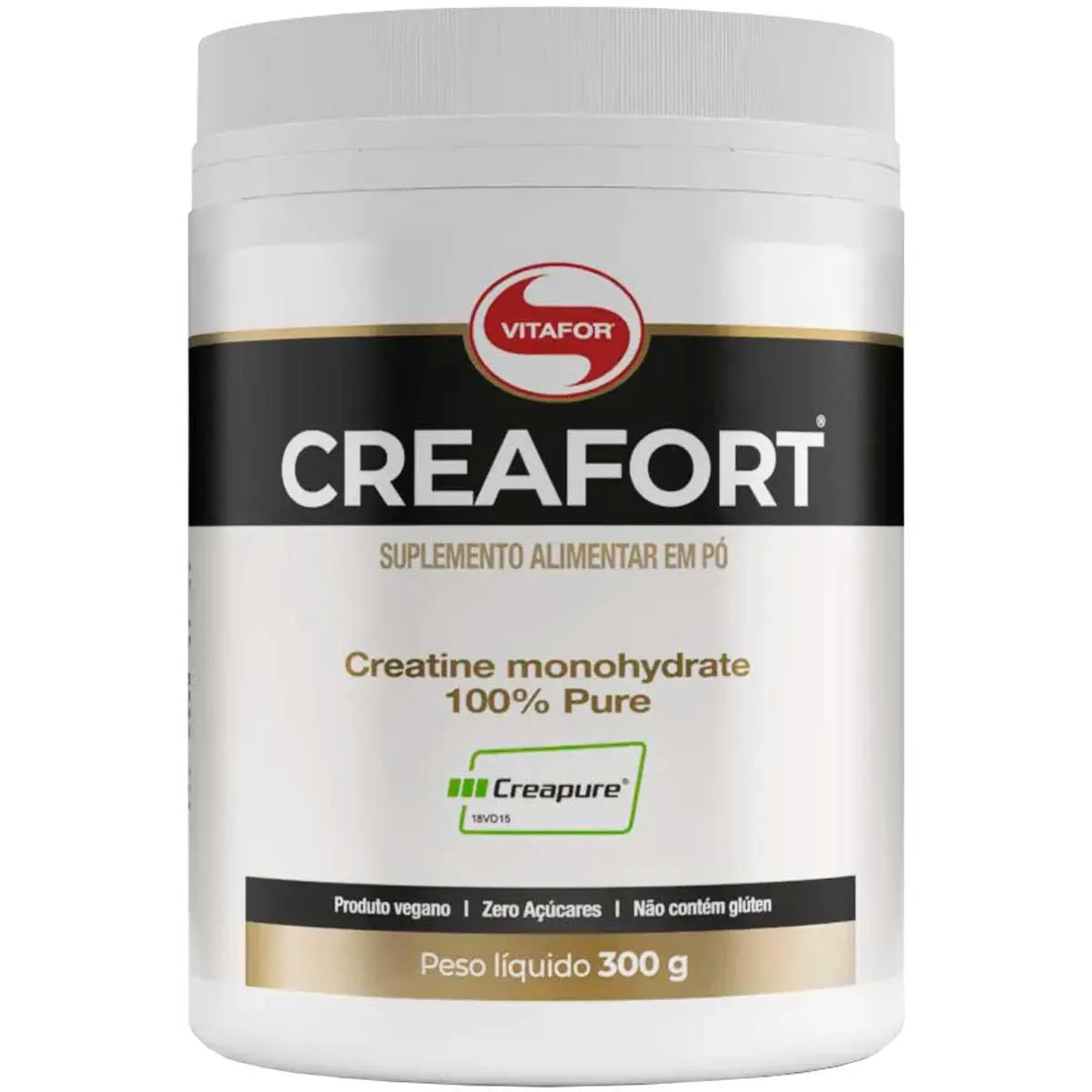 A creatina é um COMPOSTO DE AMINOÁCIDOS presente nas fibras musculares, sendo produzida em pequena quantidade pelo corpo. Encontrada em alimentos de origem animal, como boi, frango e peixe, também está disponível em suplementos. **Creafort® Vitafor**, feita com **CREAPURE®** da Alemanha, é indicada para vegetarianos e veganos por não ser de origem animal.