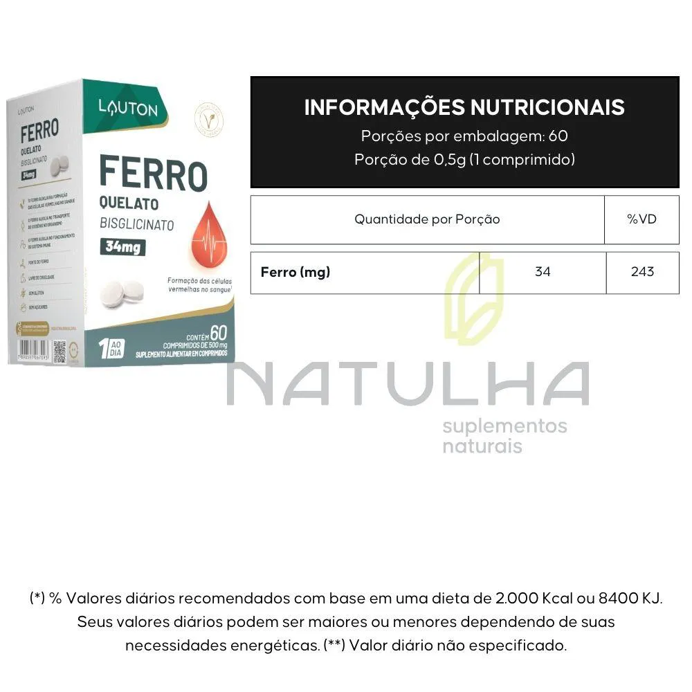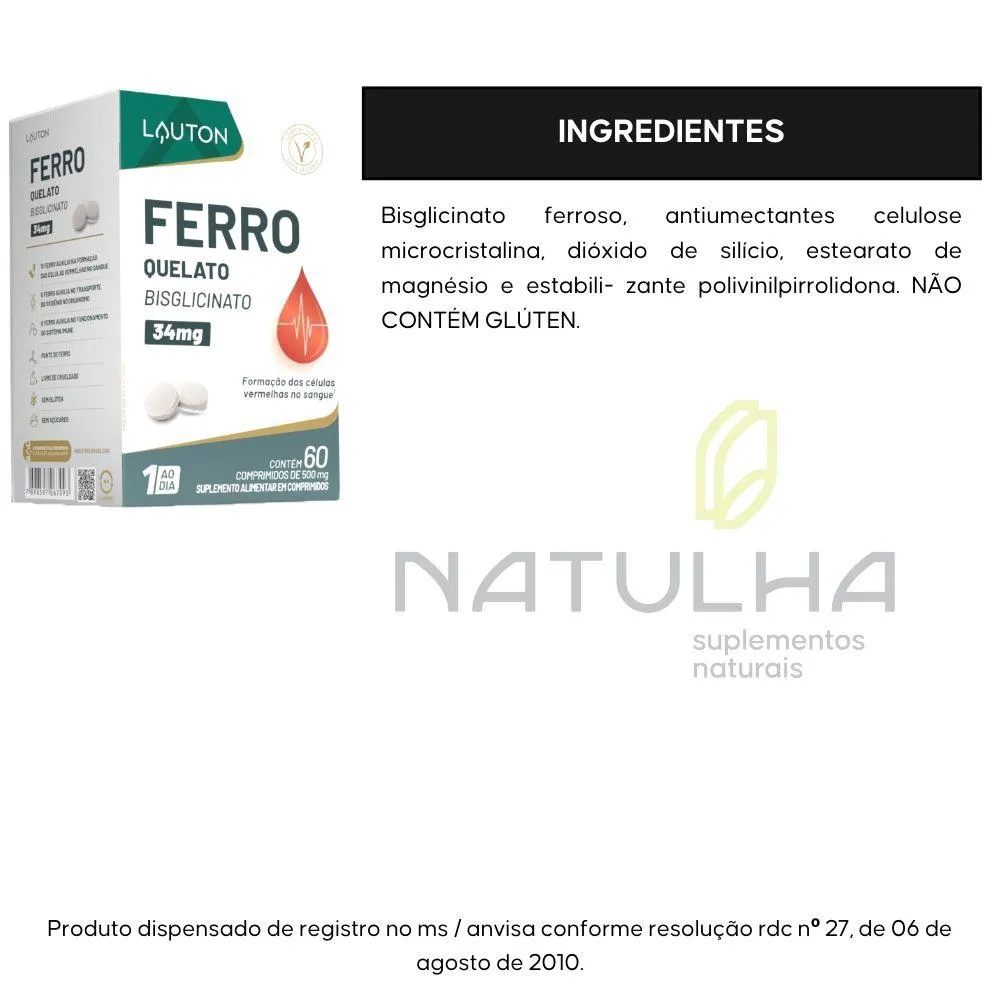 KIT com 3 unidades de Ferro Quelato Bisglicinato da marca Lauton com 60 comprimidos cada.