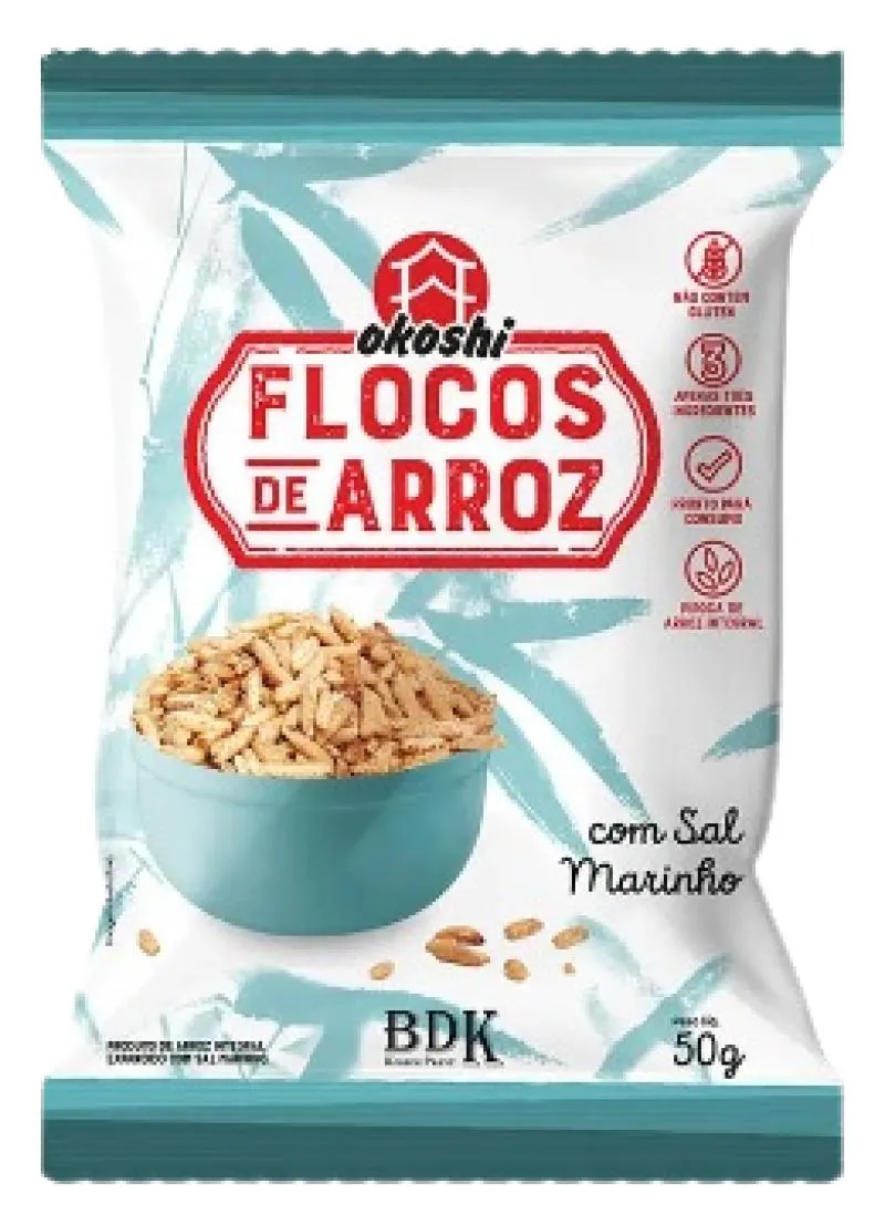 O Flocos de Arroz Integral com Sal Marinho Okoshi é super versátil e pode ser consumido tanto como pipoquinha de arroz integral, como um acompanhamento em suas sobremesas, açaís e saladas.