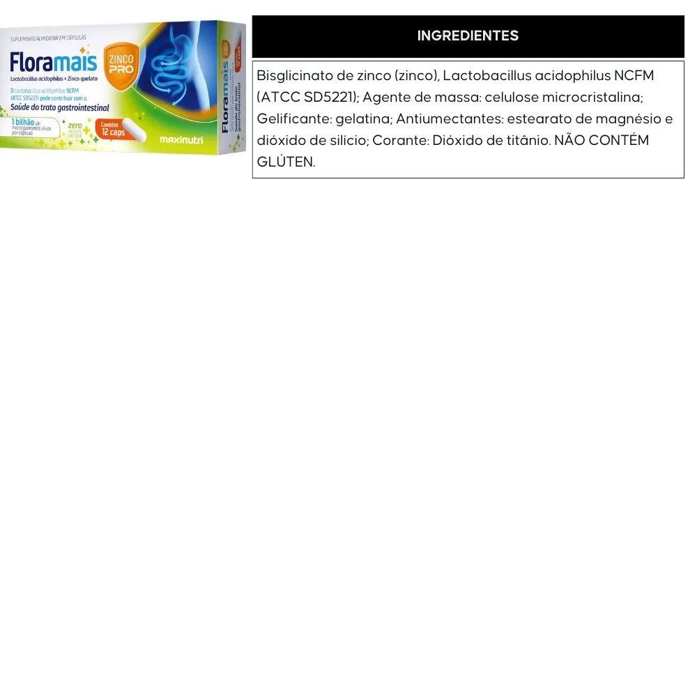 Bisglicinato de zinco (zinco), Lactobacillus acidophilus NCFM (ATCC SD5221); Agente de massa: celulose microcristalina; Gelificante: gelatina; Antiumectantes: estearato de magnésio e dióxido de silício; Corante: Dióxido de titânio. NÃO CONTÉM GLÚTEN.