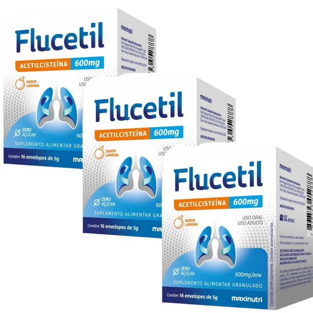 KIT com 3 caixas de Flucetil (Acetilcisteína 600mg) da marca Maxinutri com 16 sachês cada.