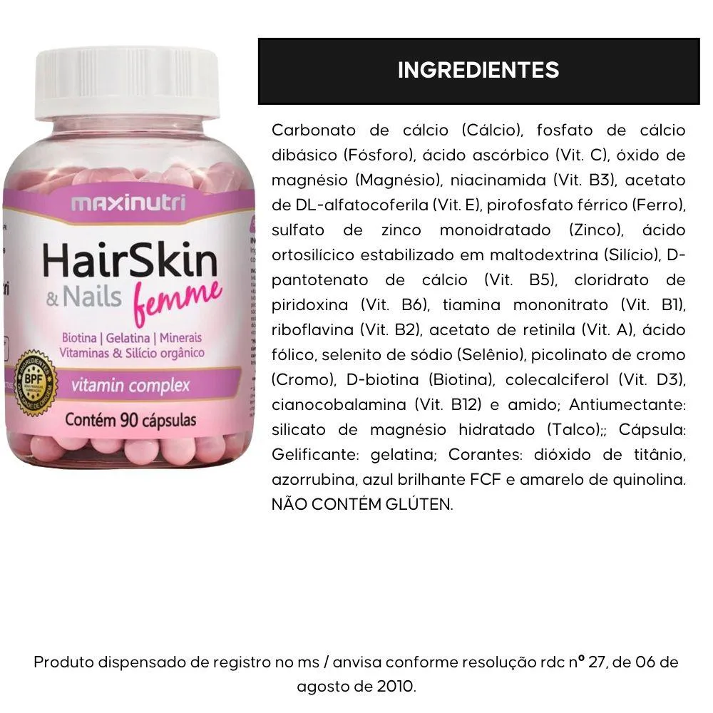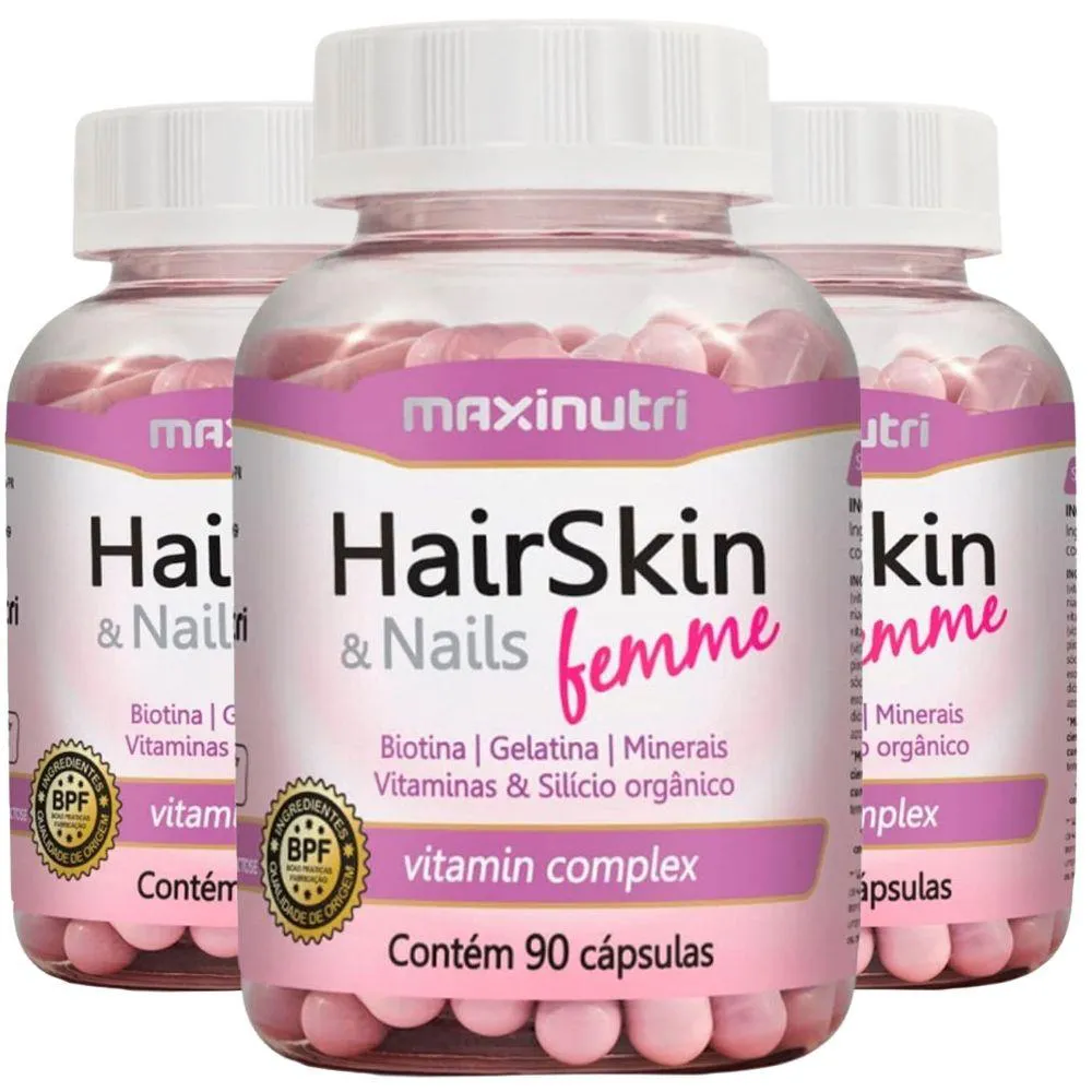 kit com 3 unidades de HairSkin Femme da marca Maxinutri com 90 cápsulas cada.