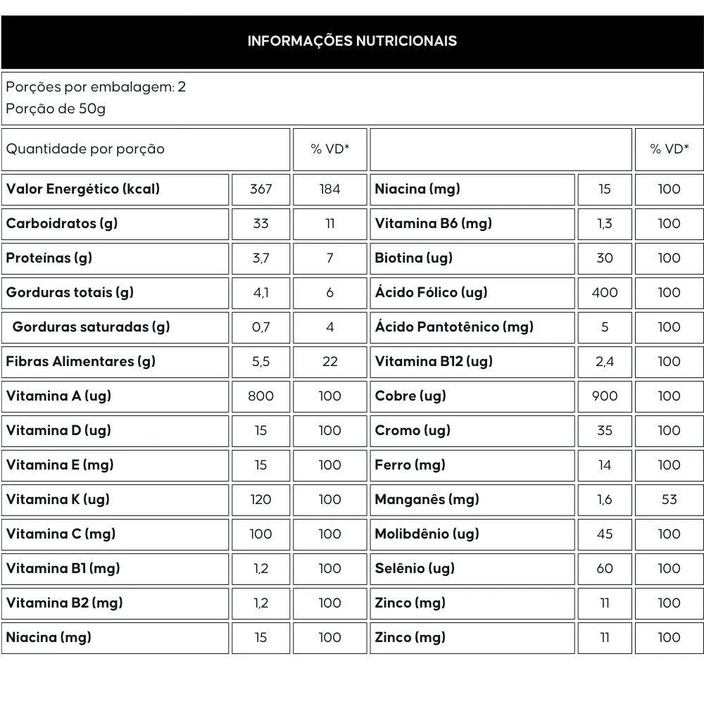 Maca peruana (Lepidium meyenii Walp.), ácido L-ascórbico (Vit. C), nicotinamida (Vit. B3), fumarato ferroso (Ferro), óxido de zinco (Zinco), D-pantotenato de cálcio (Ácido pantotênico), sulfato de manganês (Manganês), cloridrato de piridoxina (Vit. B6), tiamina mononitrato (Vit. B1), riboflavina (Vit. B2), acetato de retinila (Vit. A), ácido N-pteroil-L-glutâmico (Ácido fólico), fitomenadiona (Vit. K), sulfato cúprico (Cobre), selenito de sódio (Selênio), cloreto crômico hexahidratado (Cromo), molibdato de sódio diidratado (Molibdênio), D-biotina (Biotina), colecalciferol (Vit. D3), acetato de DL-alfatocoferila (Vit. E) e cianocobalamina (Vit. B12). NÃO CONTÉM GLÚTEN