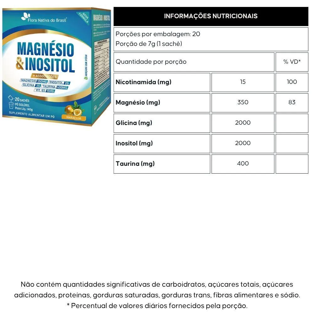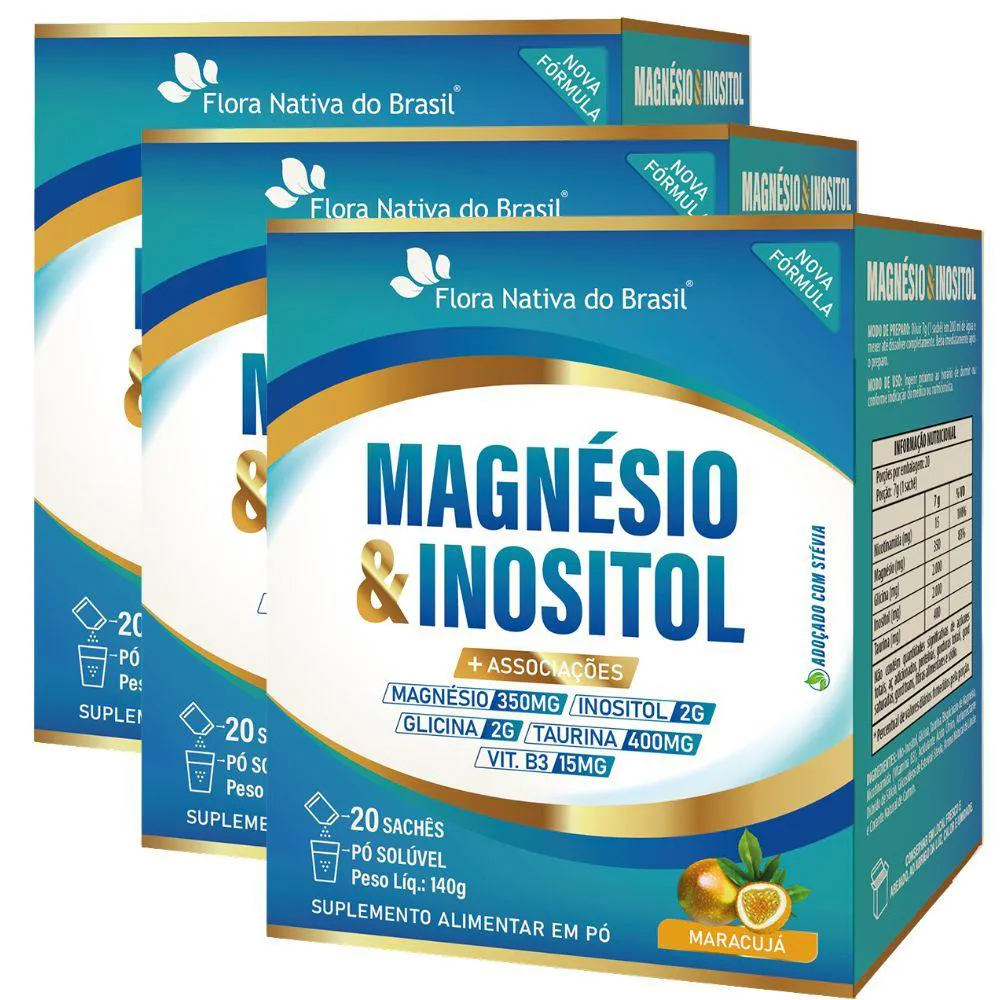 KIT com 3 unidades de Magnésio com Inositol, Glicina, Taurina e vitamina B3 da marcaFlora Nativa com 20 sachês cada.