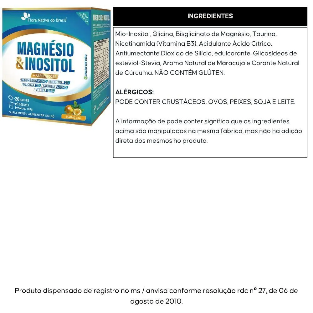 Mio-Inositol, Glicina, Bisglicinato de Magnésio, Taurina, Nicotinamida (Vitamina B3), Acidulante Ácido Cítrico, Antiumectante Dióxido de Silício, edulcorante: Glicosídeos de esteviol-Stevia, Aroma Natural de Maracujá e Corante Natural de Cúrcuma. NÃO CONTÉM GLÚTEN.