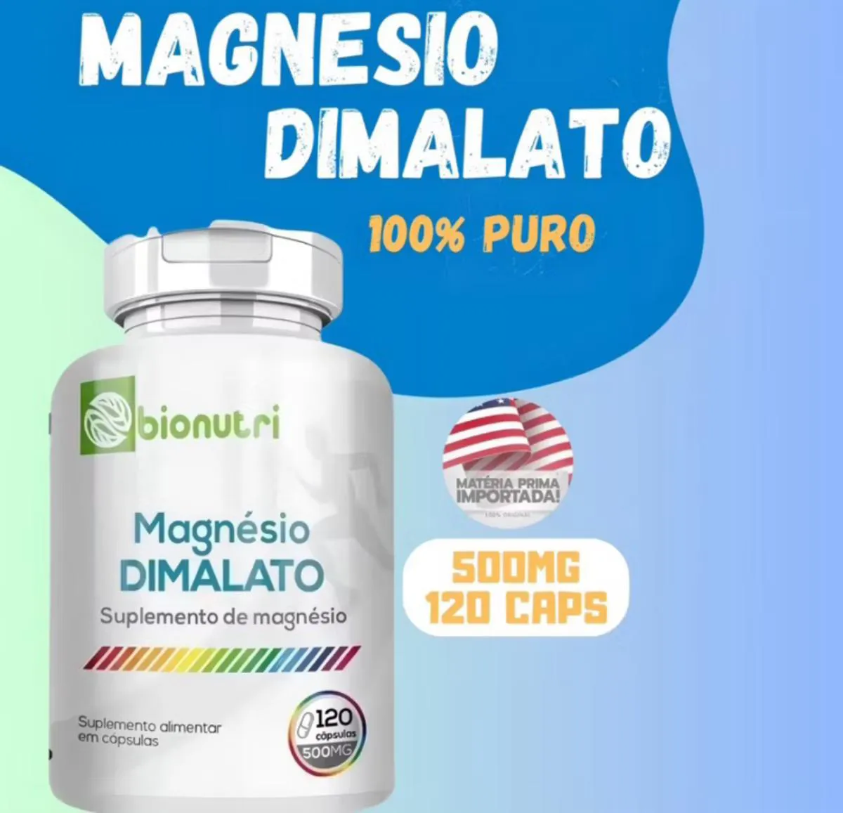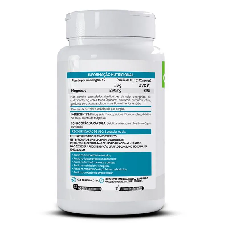 O QUE É MAGNÉSIO DIMALATO? O magnésio é um mineral encontrado em diversos alimentos como sementes, amendoim, aveia, banana ou leite, essencial para várias funções importantes no corpo. COMO TOMAR? O suplemento em cápsulas deve ser ingerido com bastante água, seguindo a recomendação de 1 a 2 cápsulas ao dia. *Este produto não é um medicamento e não tem como objetivo tratar ou curar doenças.
