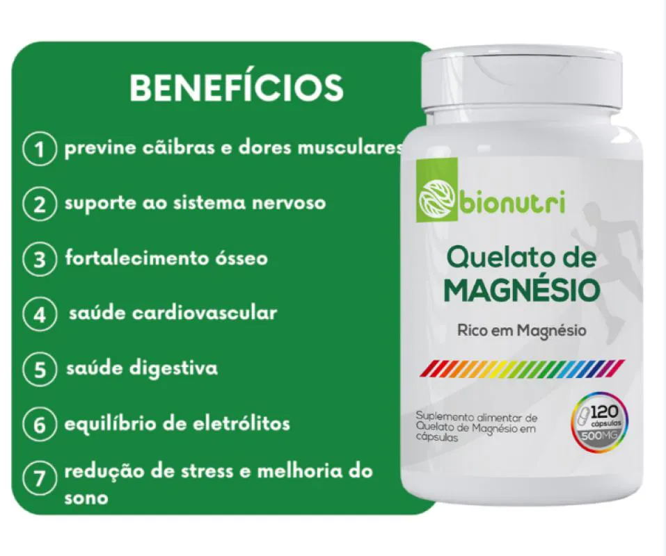 - Absorção Avançada: Formulado com magnésio quelatado, garantindo uma absorção otimizada pelo organismo. Suporte Muscular e Nervoso: Ajuda a regular a função muscular e nervosa, promovendo relaxamento e alívio do estresse. Saúde Óssea e Dental: Contribui para a saúde dos ossos e dentes, mantendo-os fortes e saudáveis. Metabolismo Saudável: Participa em processos metabólicos essenciais, auxiliando na produção de energia e na síntese de proteínas. Suporte Imunológico: Fortalece o sistema imunológico, ajudando o corpo a defender-se contra infecções e doenças.
