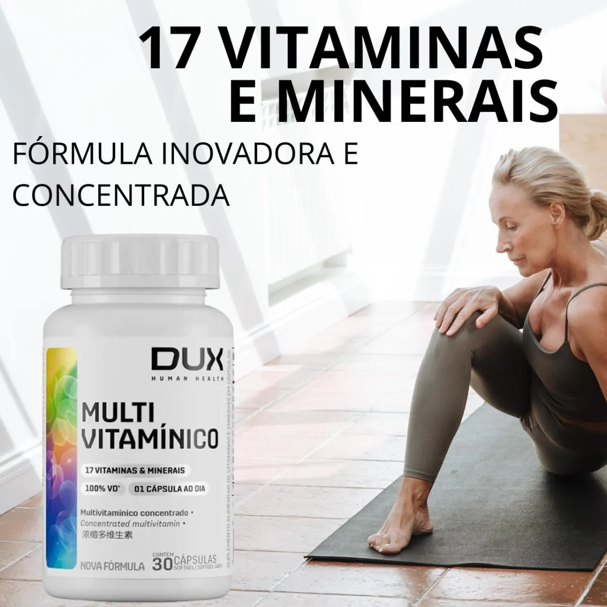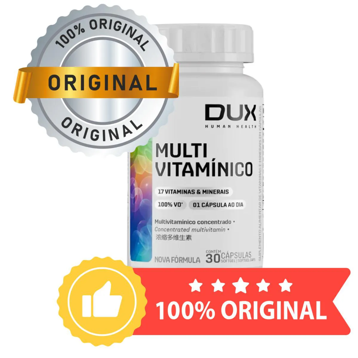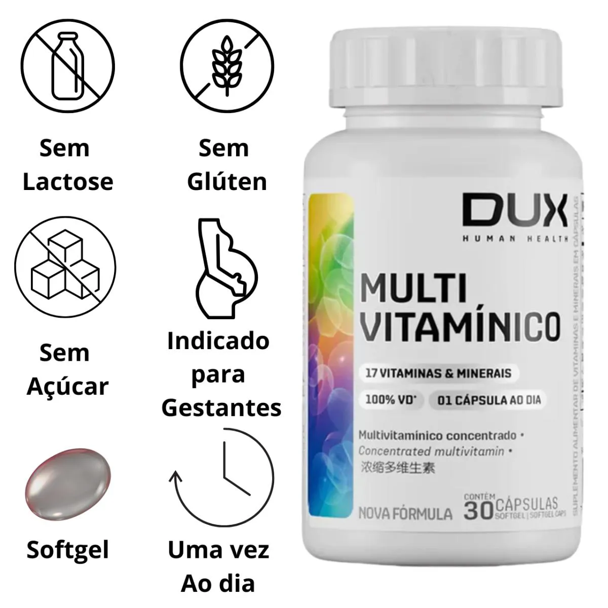 O Multivitamínico DUX com 30 cápsulas softgel é uma fórmula completa e equilibrada que oferece 100% da Ingestão Diária Recomendada (IDR) de 17 vitaminas e minerais essenciais para a saúde. Desenvolvido para promover energia, imunidade, saúde óssea, metabolismo e bem-estar, é ideal para quem busca uma rotina de suplementação prática e eficiente. Com apenas uma cápsula por dia, o Multivitamínico DUX atende às necessidades diárias de vitaminas como A, C, D, E, e do complexo B, além de minerais como zinco, ferro, selênio, cobre e outros nutrientes fundamentais para o bom funcionamento do organismo. A tecnologia em cápsulas softgel facilita a absorção e oferece mais conforto na ingestão. É um suplemento livre de açúcar, lactose e glúten, sendo uma excelente escolha para pessoas com restrições alimentares. Sua formulação também é segura para uso por gestantes e lactantes, contribuindo para uma nutrição completa durante fases importantes da vida. O produto é indicado para homens e mulheres adultos que desejam manter a saúde em dia com um suplemento confiável e eficaz. A qualidade da DUX se destaca pelo cuidado na escolha dos ingredientes e pela padronização da dosagem de cada nutriente, garantindo que você receba exatamente o que precisa todos os dias, sem excessos e com segurança. Um produto ideal para quem tem uma rotina intensa, alimentação irregular ou busca suporte nutricional contínuo. MULTIACTIVE, EMPRESA COM MAIS DE 30 ANOS DE EXPERIÊNCIA;